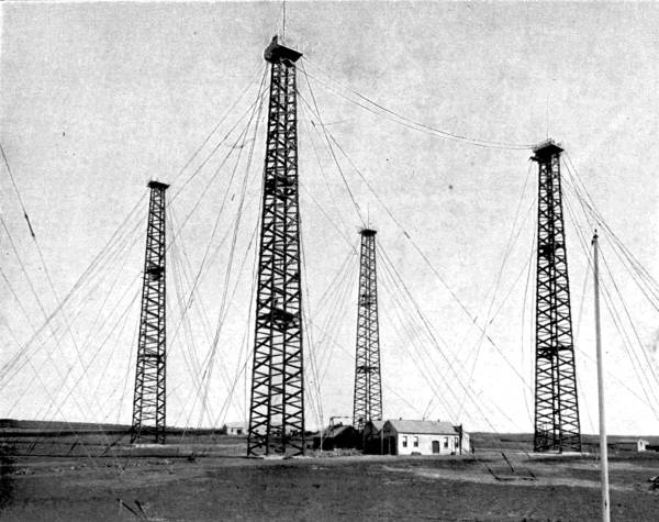 Poldhu Towers, the Station put down by the Marconi Wireless Telegraph Company, Limited, for carrying on a system of transatlantic wireless telegraphy between England and America. From the four towers are suspended the ærial wires which are carried into the buildings in the centre. The towers are 215 feet in height, and are made of wood.