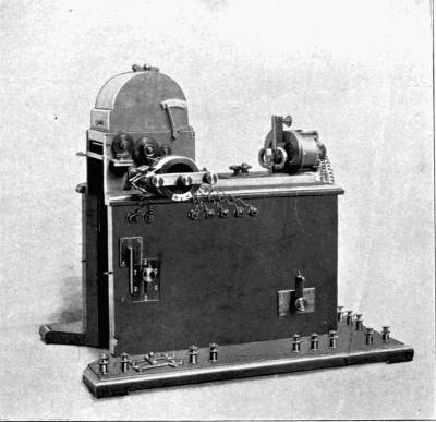 But when a Hertzian wave flying through the ether strikes the coherer, the particles suddenly press hard on one another, and make a bridge through which a current can pass. The current works a “relay,” or circuit through which a stronger current passes, opening and closing it as often as the coherer is influenced by a wave. The relay actuates a tapper that gently taps the tube after each wave-influence, causing the particles to decohere in readiness for the succeeding wave, and also a Morse instrument for recording words in dots and dashes on a long paper tape.