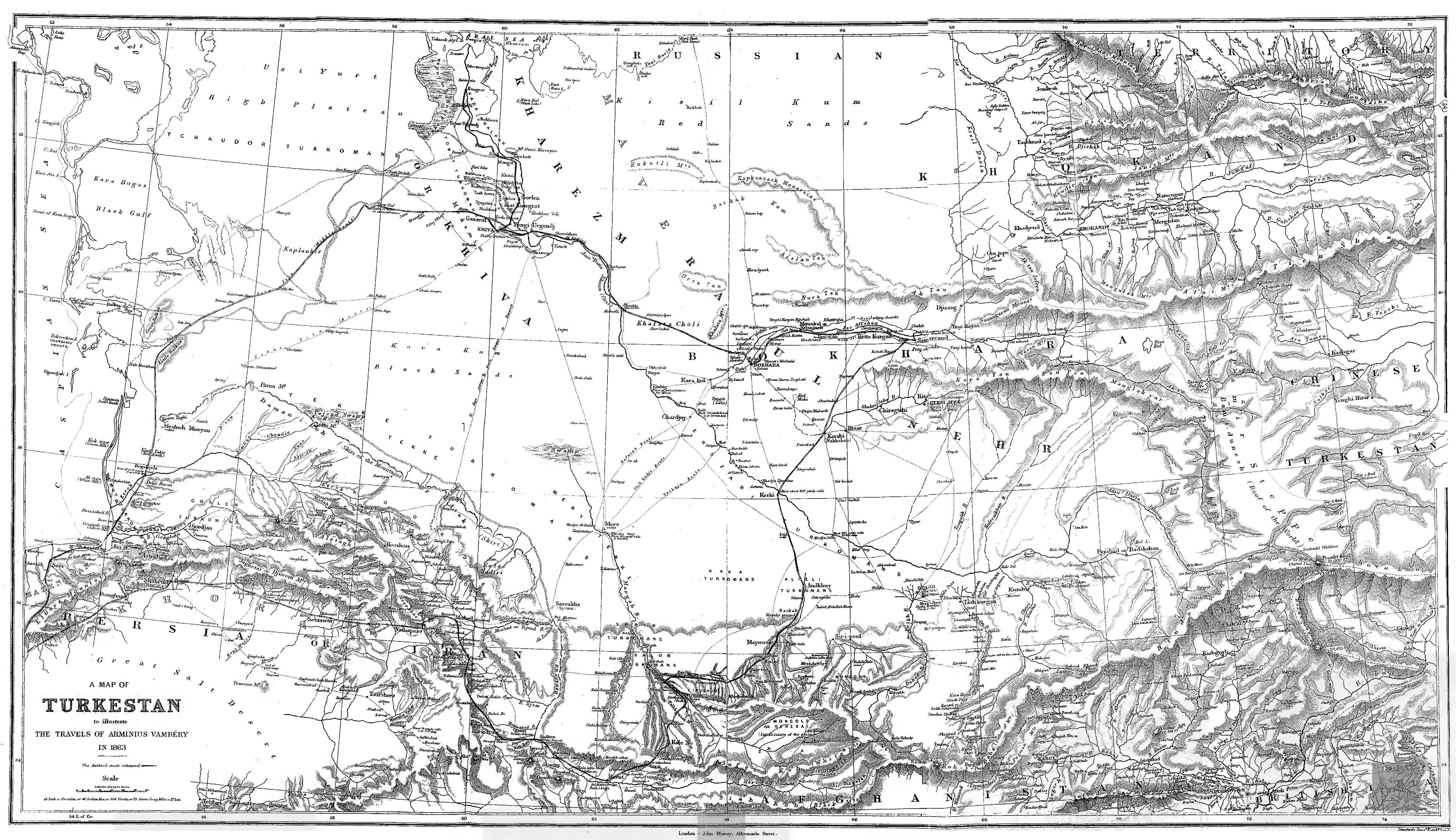 So much for the grounds and purposes of my journey. With respect to the arrangement of these pages, in order that there may be no interruption, I have divided the book into two parts; the first containing the description of my journey from Teheran to Samarcand and back, the second devoted to notices concerning the geography, statistics, politics, and social relations of Central Asia. I hope that both will prove of equal interest to the reader; for whilst on the one hand I pursued routes hitherto untrodden by any European, my notices relate to subjects hitherto scarcely, if at all, touched on by writers upon Central Asia. And now let me perform the more pleasing task of expressing my warm acknowledgments to all those whose kind reception of me when I arrived in London has been a great furtherance and encouragement to the publication of the following narrative. Before all let me mention the names of SIR JUSTIN and LADY SHEIL. In their house I found English open-heartedness associated with Oriental hospitality; their kindness will never be forgotten by me. Nor are my obligations less to the Nestor of geological science, the President of the Royal Geographical Society, SIR RODERICK MURCHISON; to that great Oriental scholar, VISCOUNT STRANGFORD; and to MR. LAYARD, M.P., Under-Secretary of State. In Central Asia I bestowed blessing for kindness received; here I have but words, they are sincere and come from the heart.