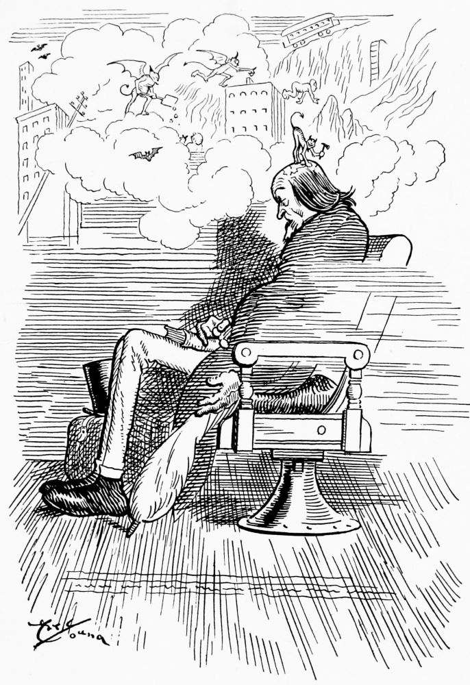 Tired and confused with the busy scenes and active incidents of the day, he is returning by night train to his home. As usual, when traveling, he reads his Divine Comedy. He has not read far when he is overcome by a sense of drowsiness. Sleepily, he reviews the events of the day in the bustling city while musing over the grewsome scenes in his book. What with the thoughts of high buildings, cable cars, of arch-heretics in their fiery tombs, slot machines, automobiles and gibbering ghosts, of swift-running elevators and headless spirits, of well-dressed gamblers and “Adam’s evil brood” at large, his mind is truly in a chaotic state.