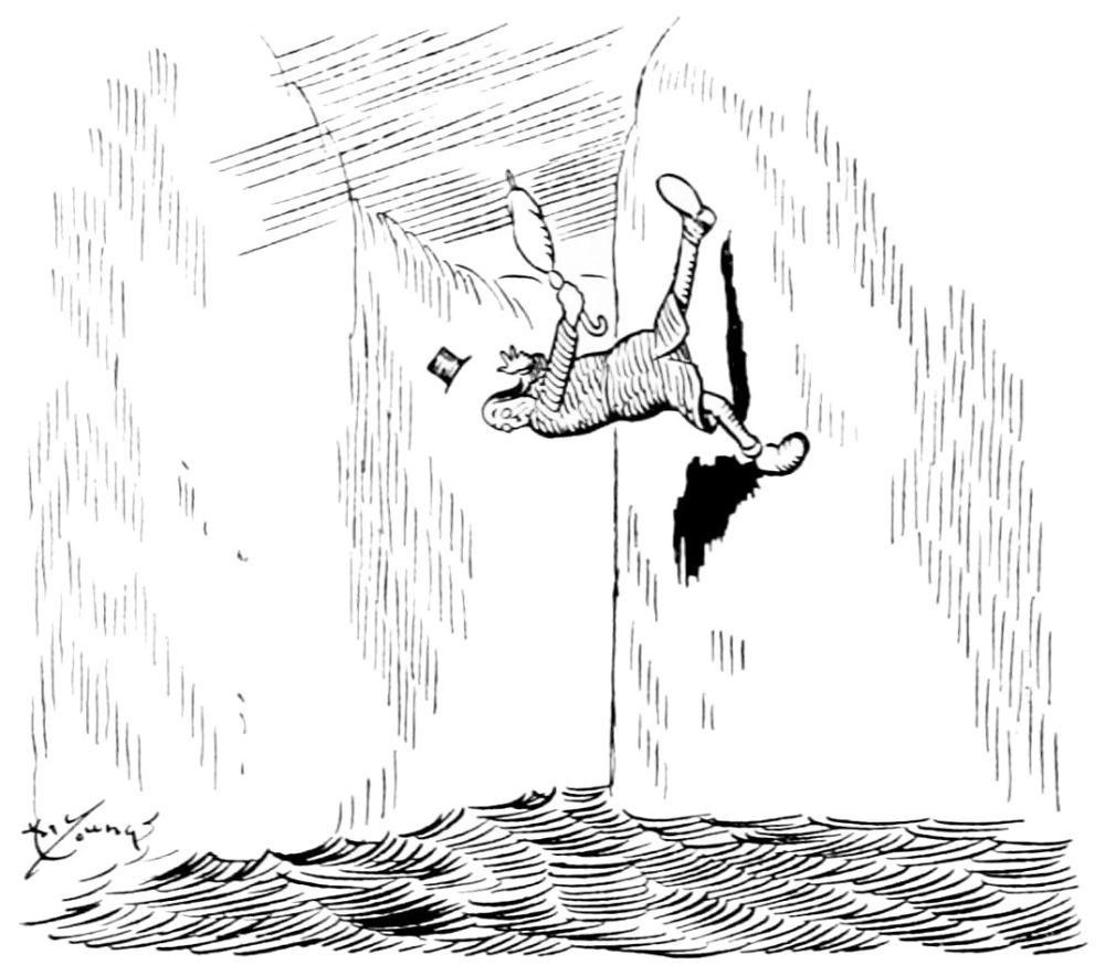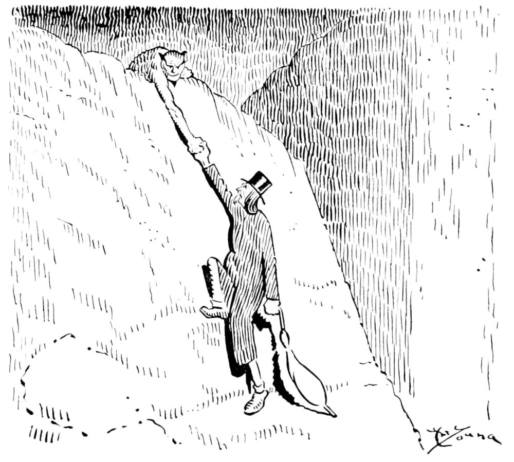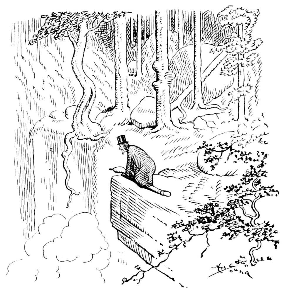 Finally, he comes to a projecting precipice from which he peers and discerns a dim light through the sluggishly rising smoke. As he crawls lower he hears voices, and a great commotion. An odor of burning brimstone fills the air. He swings out from an over-hanging rock and allows himself to drop.