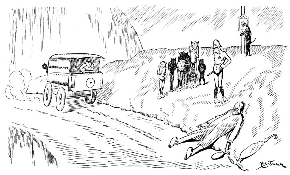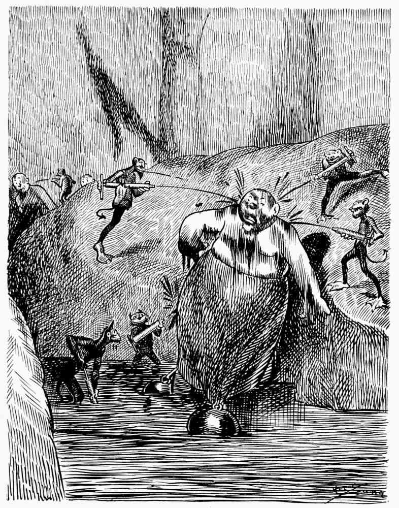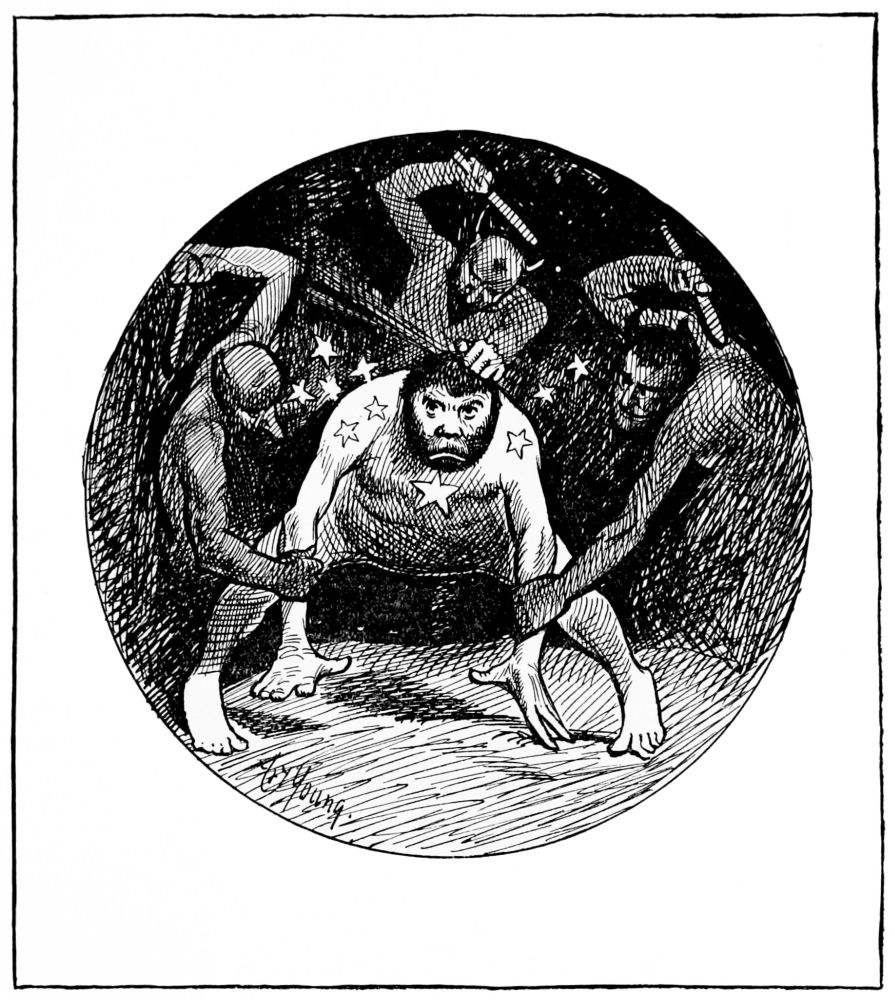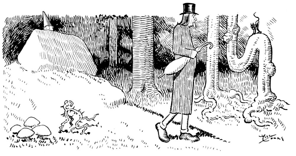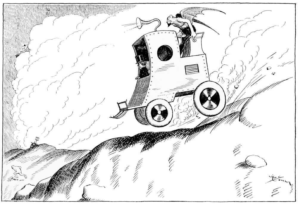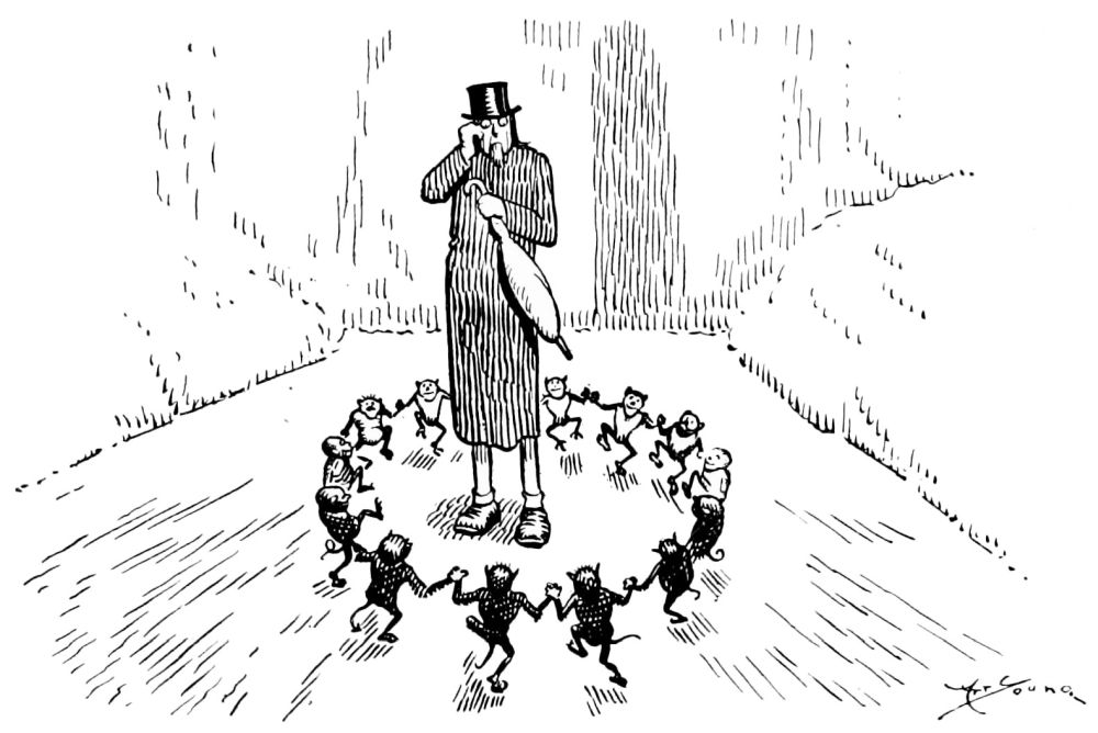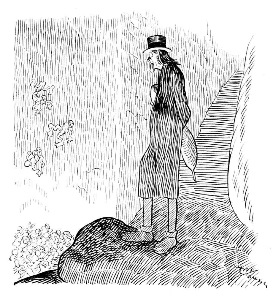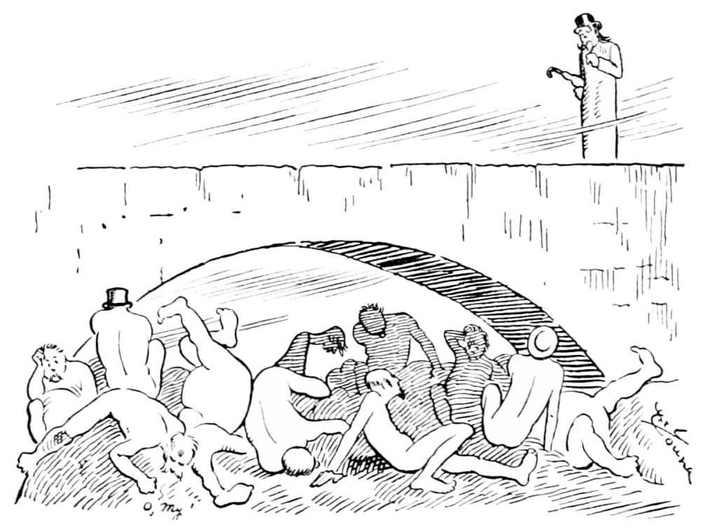 Coming into the second district Mr. Hunt is debating which way he shall proceed, when he hears a scuffling on the heated asphalt road behind him. He turns and sees passing a drove of human-footed sheep, led by a monkey, whose contortions they are compelled to imitate. Mr. Hunt consults his guide book and learns that these are the people who did things because others did them, never taking the trouble to think for themselves.