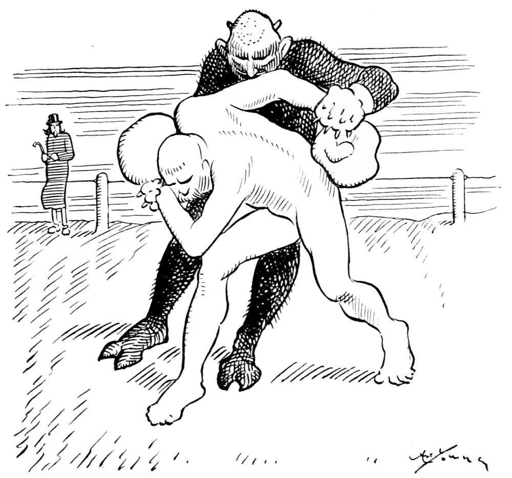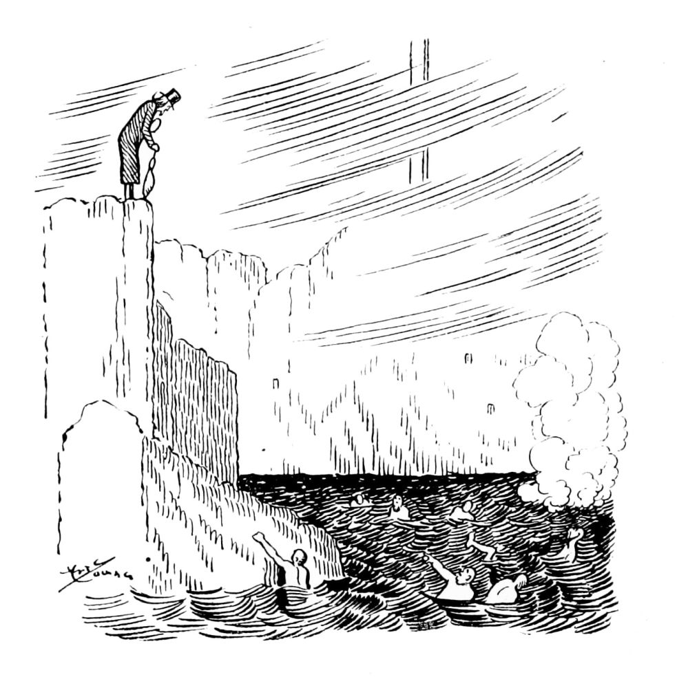 Mr. Hunt sees Charon’s boat take on a load of passengers. He watches it pull out from the pier and cross the river. An orchestra, consisting of a bass horn and an accordion, supplies the torture on the run from shore to shore. Wearing nothing but a mackintosh and gaiters the Captain stands on the roof of the pilot house grimly scanning the black waves.