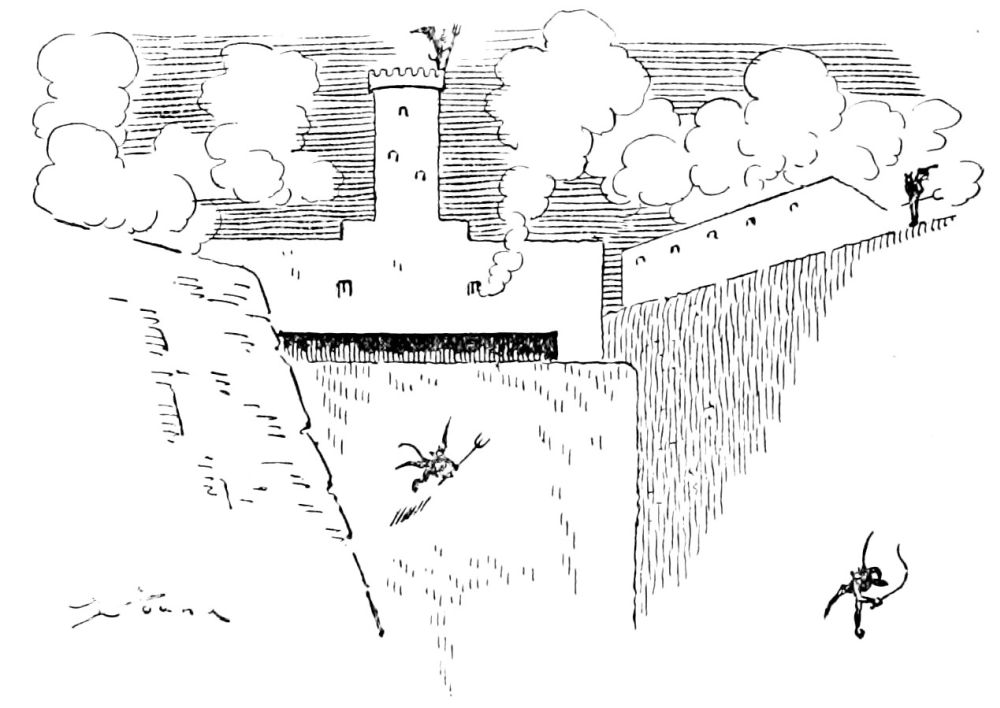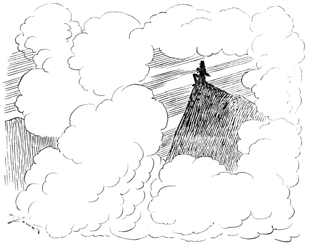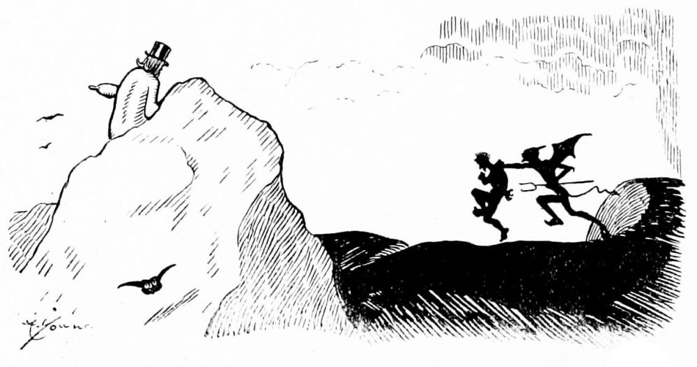 The explorer now determines to find Satan. To avoid the difficulties that Dante met with, it is Mr. Hunt’s purpose to get a permit to pass through the Empire from the Devil himself. Though Demons pursue him with persistency he succeeds in reaching a huge arched entrance in an immense purple rock. Over it is a blazing inscription reading: “Satan’s office.” Here Mr. Hunt pauses. For a moment he is afraid. He regains his courage, and, mounting an elaborate fire-escape, enters. “As a night-hawk cleaves a side flight in the sky,” says the poet-explorer, “so the great arch-enemy of mankind wheeled round in his chair as I entered.”