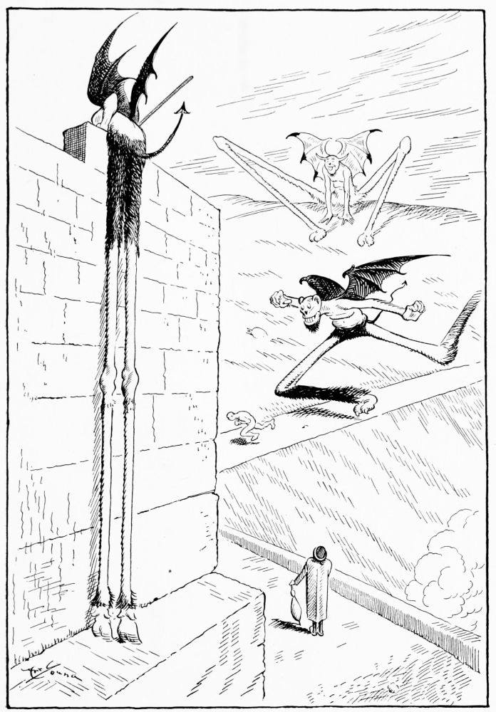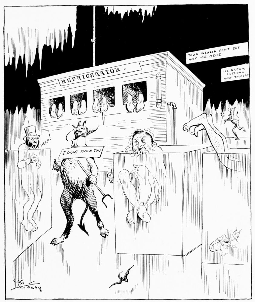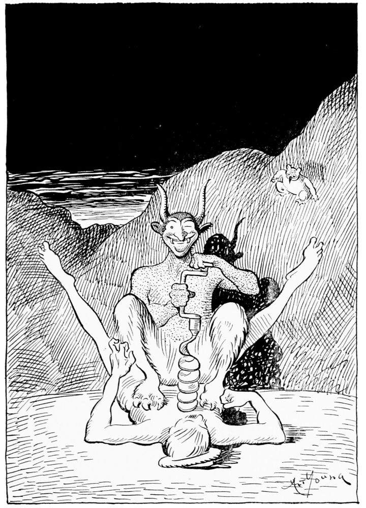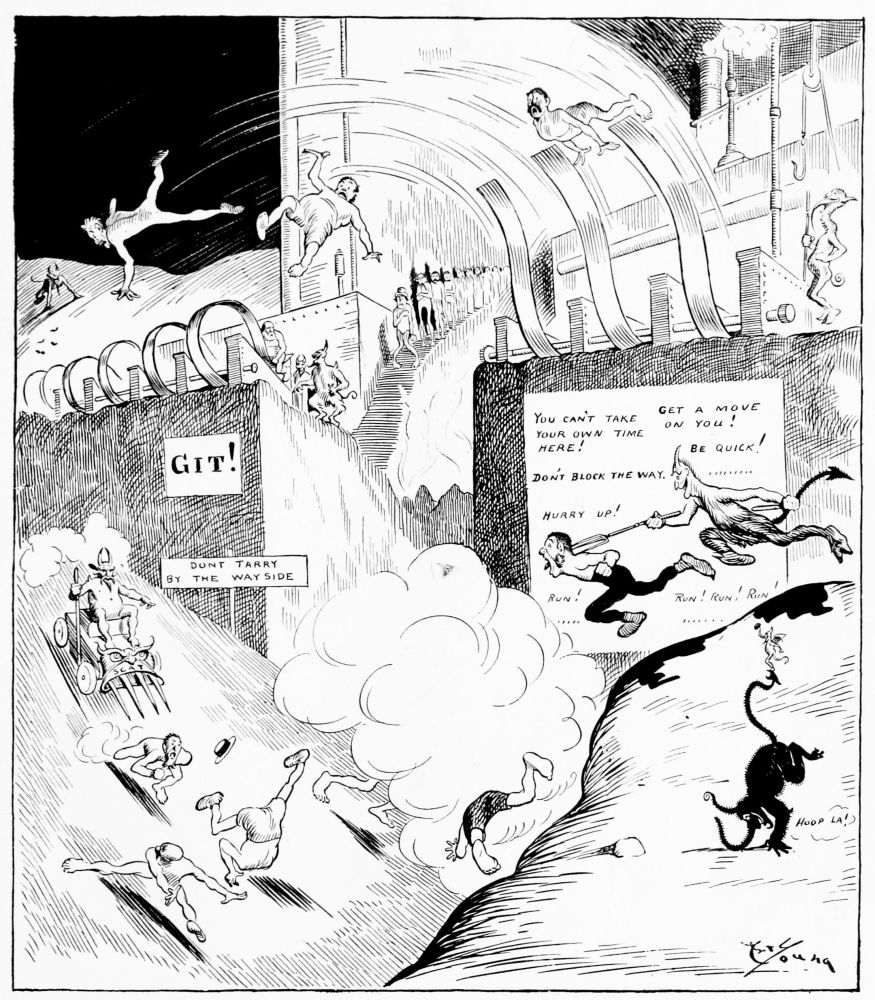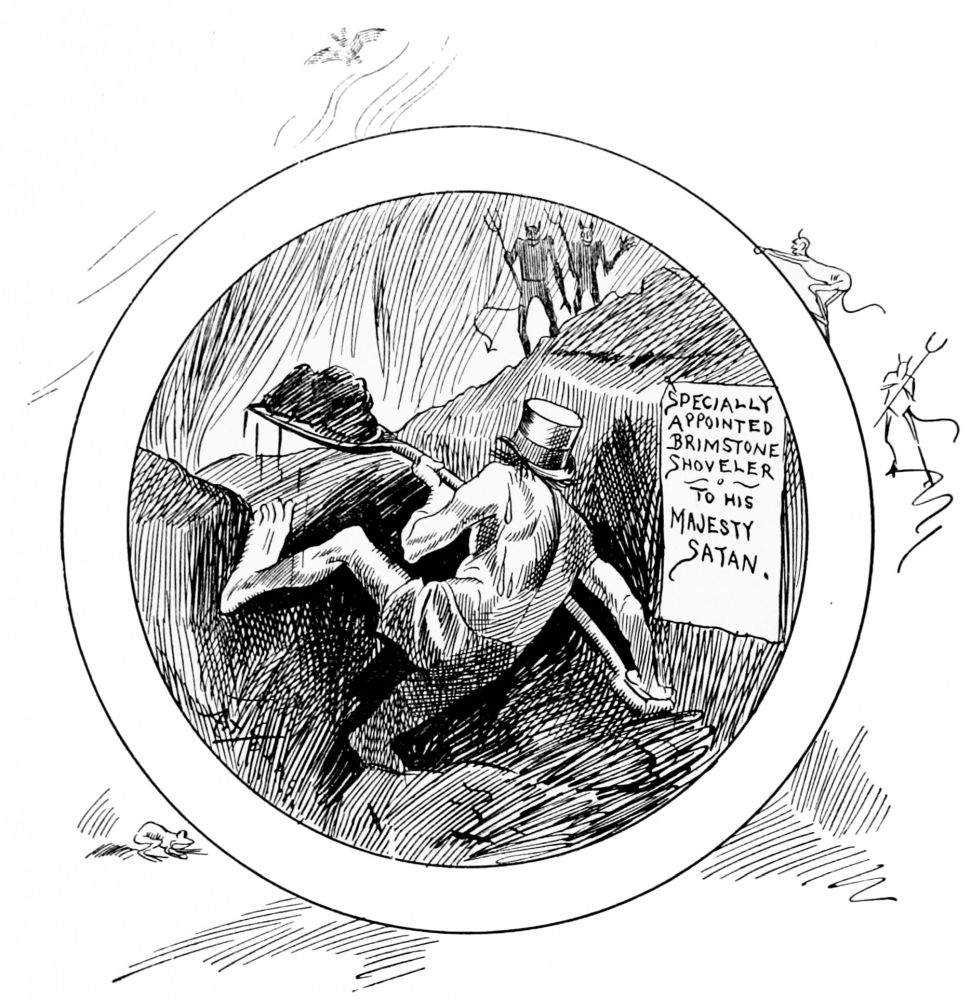Hiprah Hunt is at the American entrance to Hell. He stands amidst a throng of Demons, sinners and employees of the realm. Crowds of men are getting overcoats checked and buying fans. He buys one himself, and also secures a guide book, locating the different sections and departments. He sees over the portal’s lofty arch the words “Leave all hope on the outside.” This demand he will not entirely accede to. He retains a little, thinking he may need it later on.