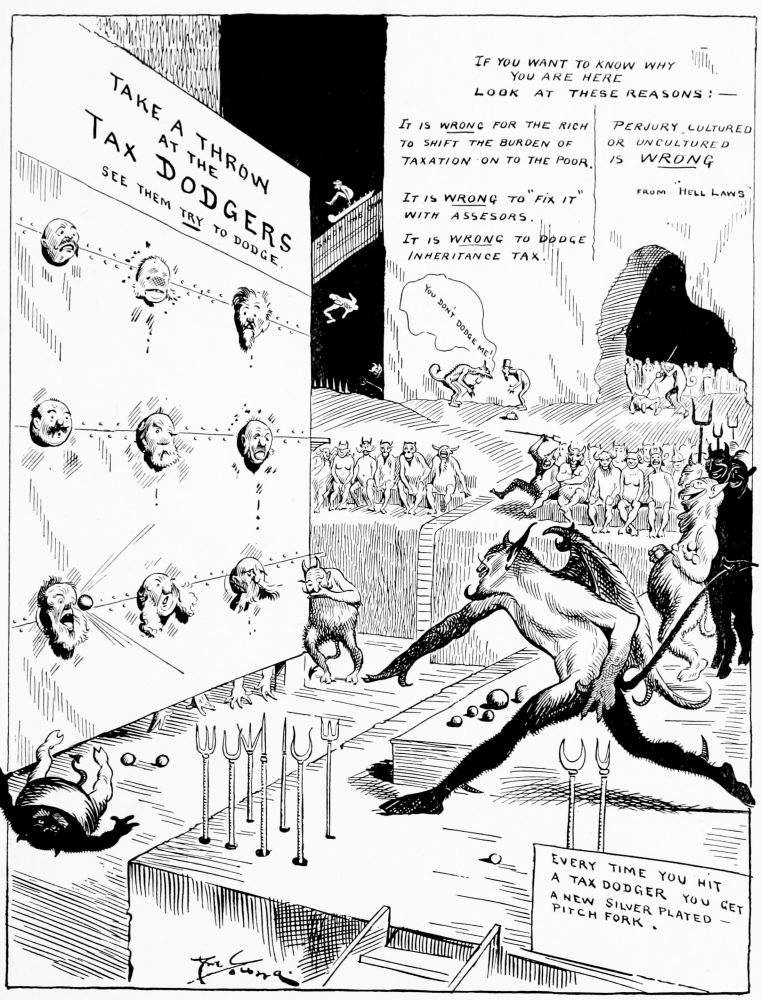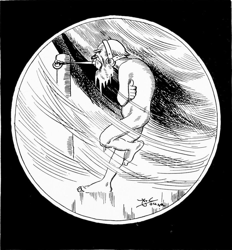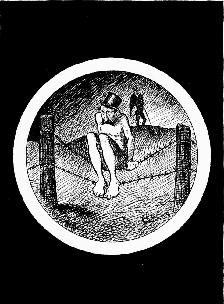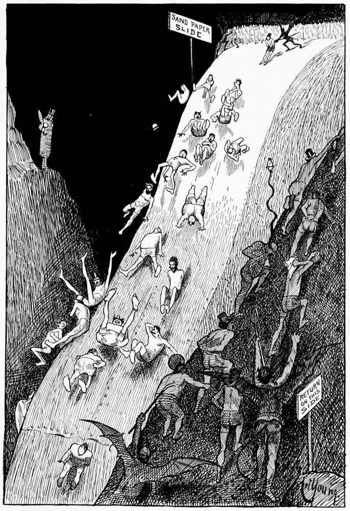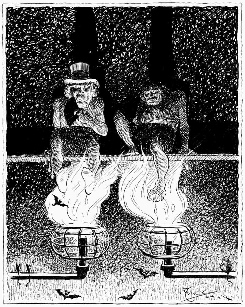 Hiprah Hunt is at the American entrance to Hell. He stands amidst a throng of Demons, sinners and employees of the realm. Crowds of men are getting overcoats checked and buying fans. He buys one himself, and also secures a guide book, locating the different sections and departments. He sees over the portal’s lofty arch the words “Leave all hope on the outside.” This demand he will not entirely accede to. He retains a little, thinking he may need it later on.