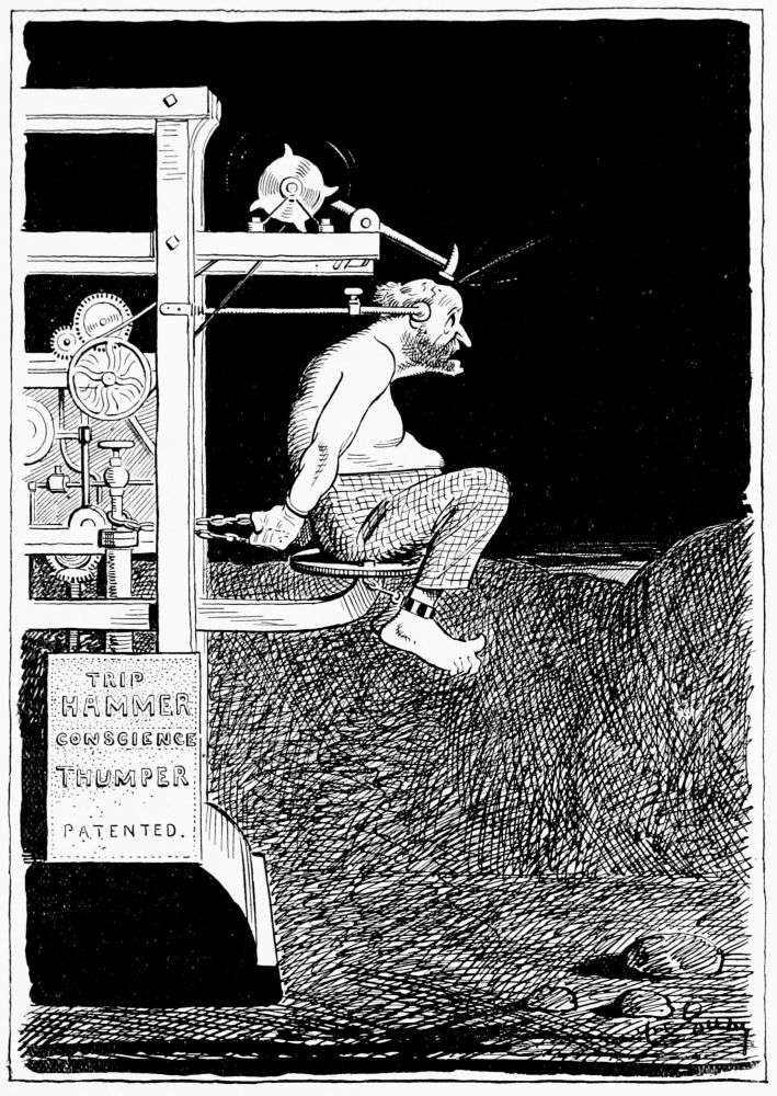 “Doesn’t it serve men right who think they can go through life cheating, cursing, liquor-drinking, lying and raising Cain generally to find in the end that it’s time to pay up. (A thousand voices: Sure! Give it to ’em; Hunt’s all right.) On all the winds of the upper world are borne the croaking of the crows of modern thought. But depend upon it, one voice, the voice of Hiprah Hunt, shall always be raised against them in defence of this great Infernal Empire.