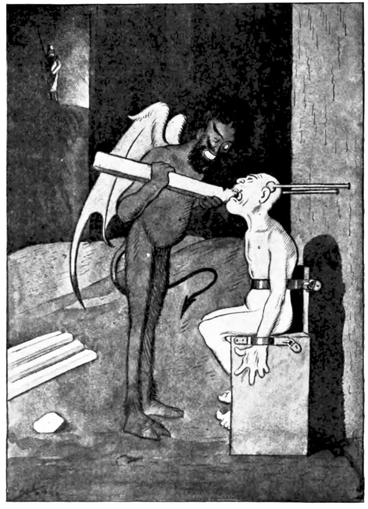 As President of a Dante Club he collected many books on the subject of future retribution. Among them (some 80 volumes) he chiefly prizes Dante’s Inferno. Whenever he is given an opportunity he will deliver a lecture on Dante and his work. In short, Hell books have so thoroughly absorbed his mind that he becomes convinced that the under-world is as much a reality as the upper one.