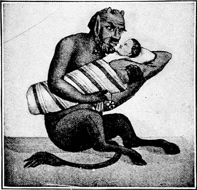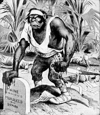 Another equally hideous cartoon by Hamilton is that entitled "The Spanish Brute Adds Mutilation to Murder." It shows a hideous ape-like monster representing Spain, one blood-dripping hand smearing the tombstones erected to the sailors of the Maine and the other clutching a reeking knife. All about him under the tropical trees are the bodies of his (p. 337) mutilated victims. The expression of the monster's countenance is a lesson in national prejudice. It shows how far a well-balanced nation may go in moments of bitterness and anger.