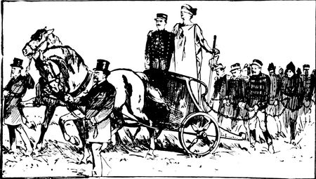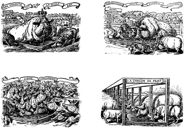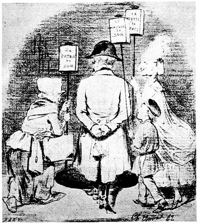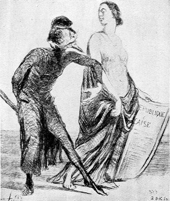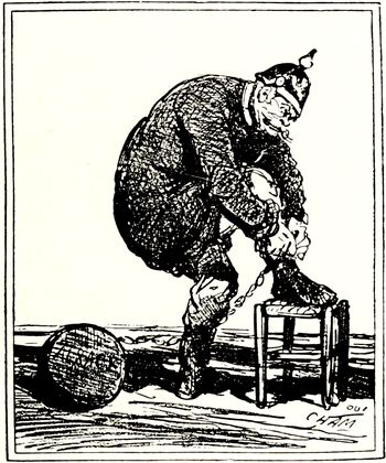 The spirit of anti-Dreyfussard caricature was Anti-Semitism. One of the most striking of the cartoons on this side purported to contrast France before 1789 and France at the end of the Nineteenth Century. In the first picture we (p. 351) were shown a peasant toiling laboriously along a furrow in the ground, bearing on his shoulders a beribboned and beplumed aristocrat of the old régime, whose thighs grip the neck of the man below with the tenacity of the Old Man of the Sea. That was France before the Revolution came with its bloody lesson. In the picture showing France at the end of the Nineteenth Century there was the same peasant toiling along at the bottom, but the burden under which he tottered was fivefold. Above him was the petty merchant, who in turn carried on his shoulders the lawyer, and so on until riding along, arrogantly and ostentatiously, at the top was the figure of the foreign-born Jew, secure through the possession of his tainted millions.