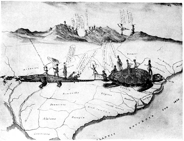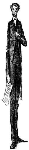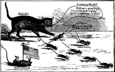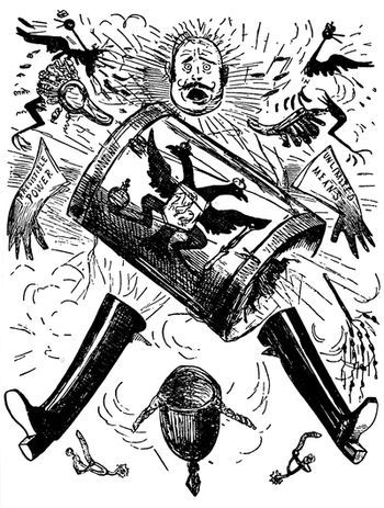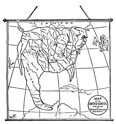 In contrast with the vindictive and malicious character of (p. 316) the cartoons which heralded Mr. Cleveland's first election, there was a marked absence of unpleasant personalities in those which belong to the period of his second term. There was no disposition, however, to spare him in regard to the growing difficulty he had in holding his party together or his assumption of what Republicans regarded as an entirely unwarranted degree of authority. This autocratic spirit was cleverly satirized by a cartoon in Judge, to which allusion has already been made. It consists simply of a map of the United States so drawn as to form a grotesque likeness of the President. He is bending low in an elaborate bow, in which mock-humility and glowing self-satisfaction are amusingly blended, his folded hands forming the Florida peninsula, his coat-tails projecting into lower California. Beneath is inscribed the following paraphrase: