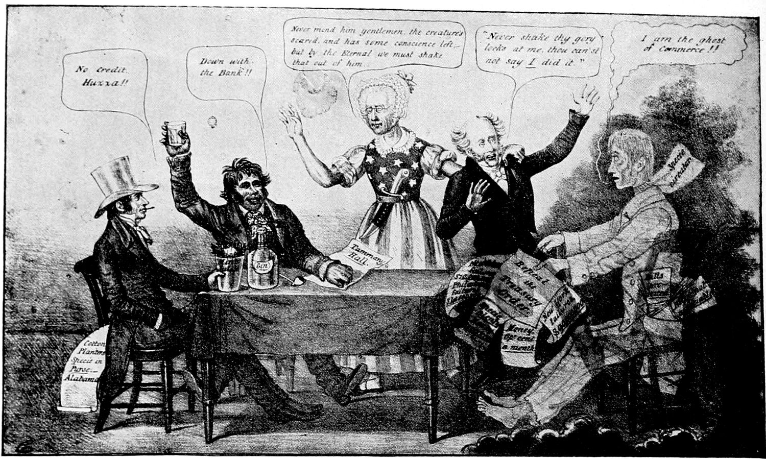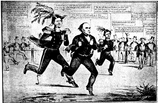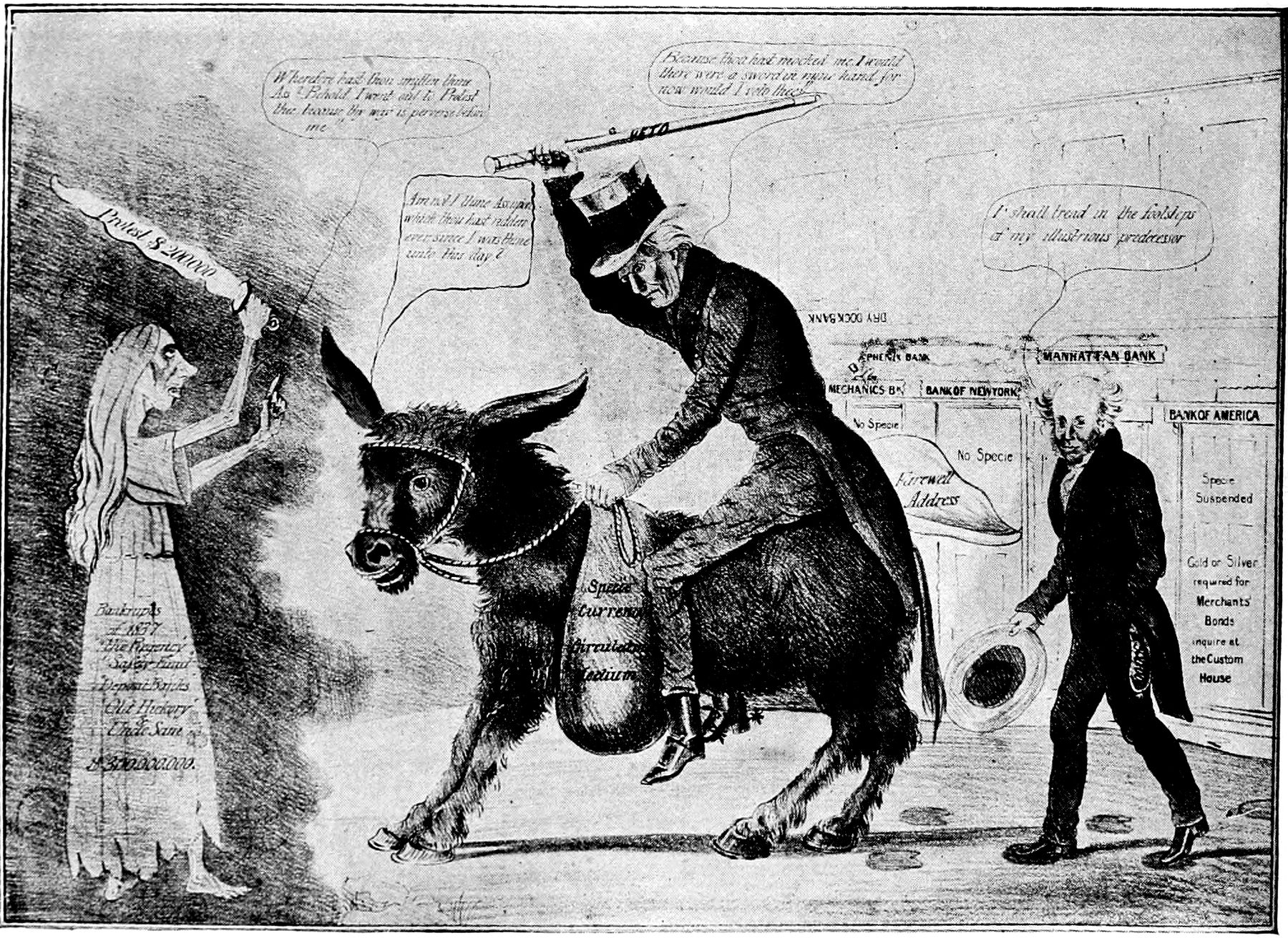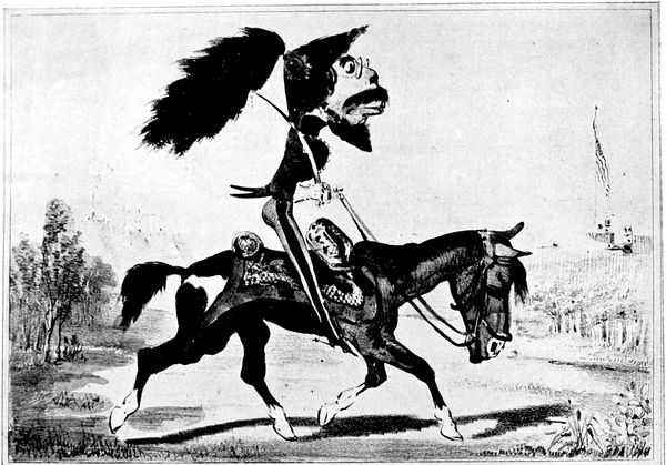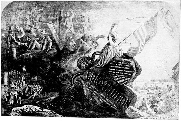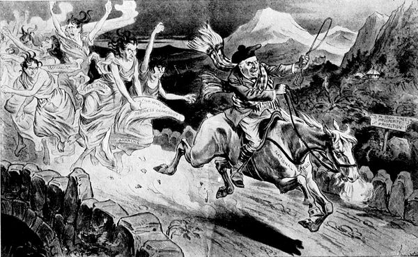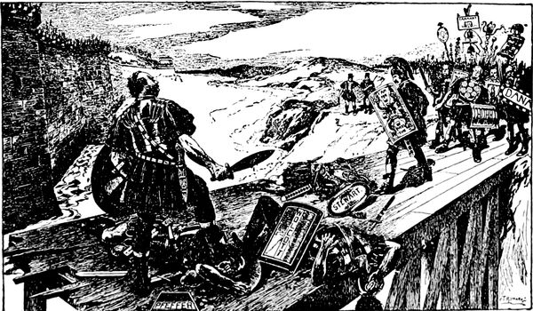 Another cartoon of sterling literary flavor is that representing Mr. McKinley as a political Tam o' Shanter, which appeared during the exciting election of 1896. The countenance of Tam in this cartoon shows none of the anxiety and mental perturbation of the hero of Burns' poems. You (p. 325) can see that he has full confidence in his good mare, "National Credit," and is perfectly convinced that she will carry him unscathed over the road to Good Times, Prosperity, and Protection. The carlins have been close at his mare's heels, however, and as he passes the bridge over which they dare (p. 327) not cross, the foremost of his pursuers has caught and pulled away as a trophy the tail of the steed. The tail, however, is something with which he can well part, for it typifies four years of business depression. The leaders of the pursuing carlins are Free Trade, Anarchy, Sectionalism, and Popocracy.
