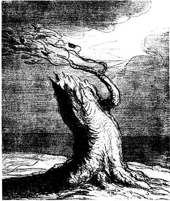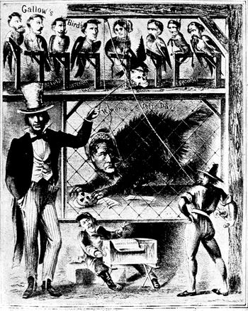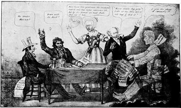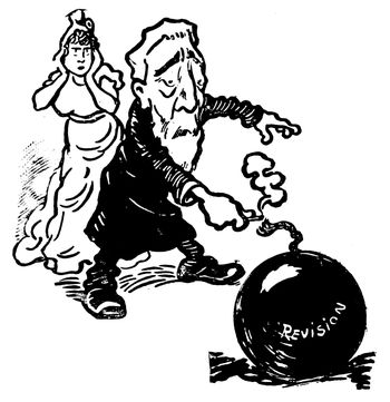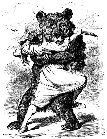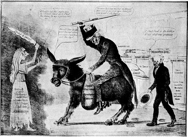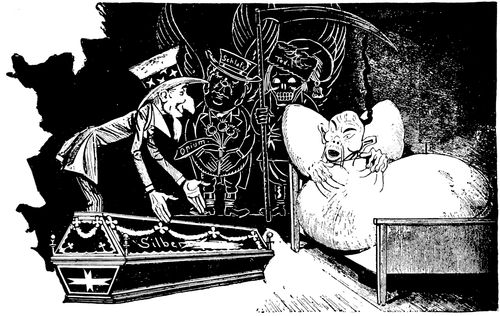 Mr. Bryan's appeal to the farmer in 1896 was hit off by Hamilton in a powerful, but exceedingly blasphemous, cartoon entitled "The Temptation." Bryan in the form of a huge angel of darkness has taken the farmer to the top of a high mountain to show him the riches of the world. As far as the eye can see stretch oceans and cities and hills and rivers and mountains of silver. It is a great pity that so grim and (p. 328) powerful a cartoon should have been marred by that display of bad taste which has been too frequent in the history of caricature.