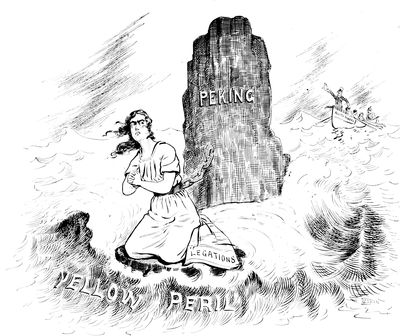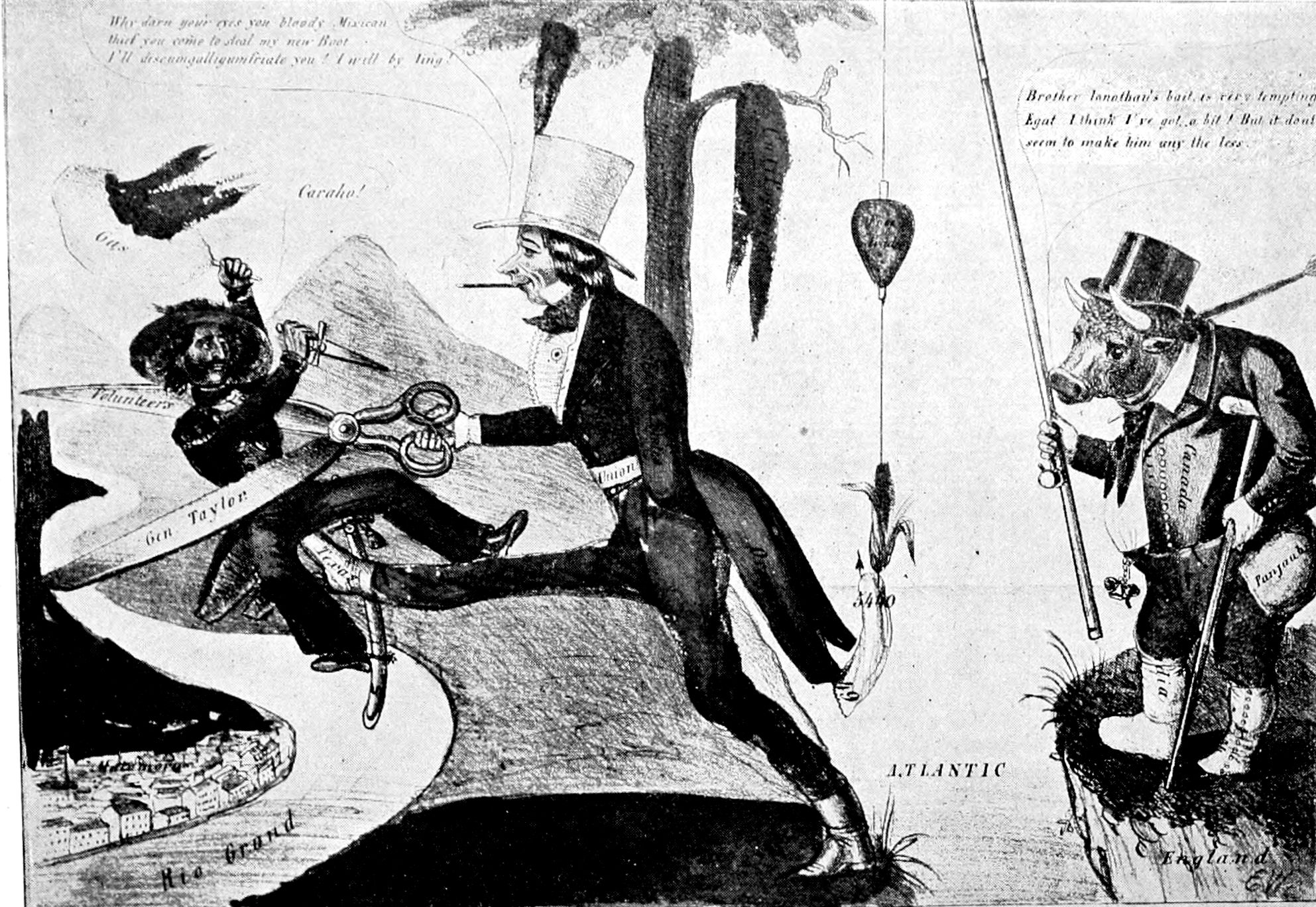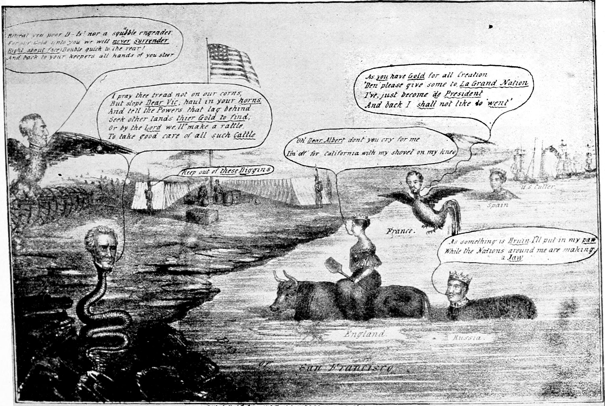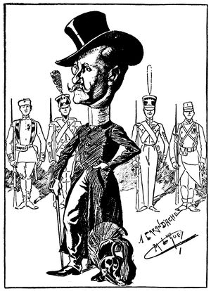 One of the most striking and amusing of all the cartoons evoked by the results of the Spanish-American War appeared in Punch at a time when our departure from our traditional policy began to cause comment in Europe. There are two figures, that of Dame Europa and that of Uncle Sam. Dame Europa is a lady of frigid aspect, with arms folded, and who has drawn herself up to full height as she gazes scornfully at the complacent and unruffled Uncle Sam. "To whom do I owe the honor of this intrusion?" she asks icily. "Marm, my name is Uncle Sam." "Any relation of the late Colonel Monroe?" is the scathing retort.