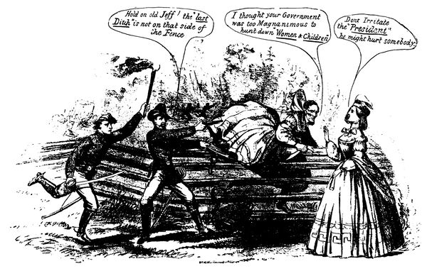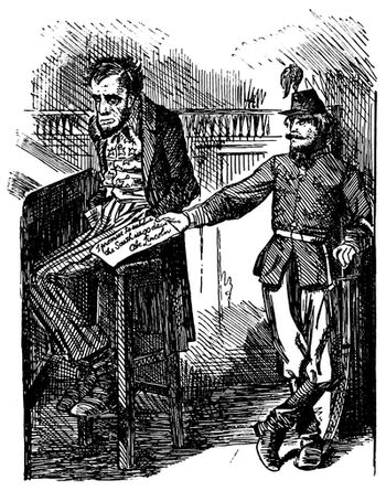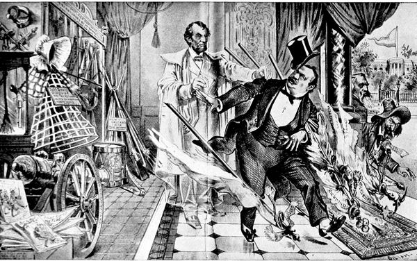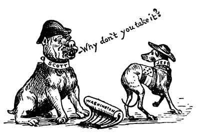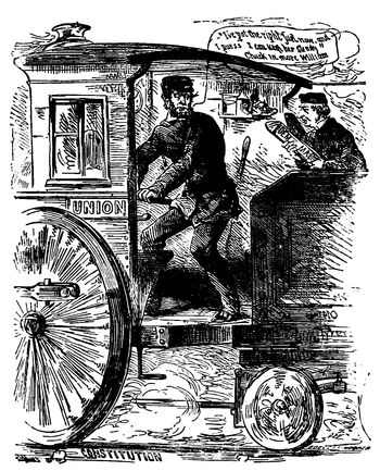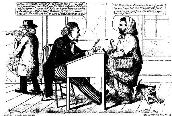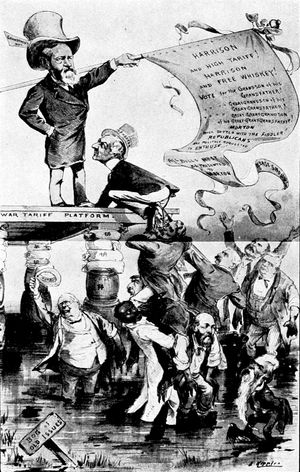 Mr. Cleveland's determination to return to the South the flags captured in the War of Secession, in the hopes of putting an end to sectional feeling, brought down upon his head the wrath of the more extreme Republican element, a wrath (p. 321) which was reflected strongly, editorially and pictorially, in the papers of the day. This suggested to Judge the cartoon entitled "Halt," in which Mr. Cleveland, in the act of handing back the captured flags, is restrained by the spirit of Lincoln, which says, "Had you fought for those flags you would not be so quick to give them away!" To which Mr. Cleveland is made to reply, "Great Scott! I thought you were dead and forgotten long ago. I only meant to please Mr. Solid South. They're rubbish, anyhow." This is another cartoon from the hand of the prolific Gillam.