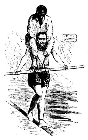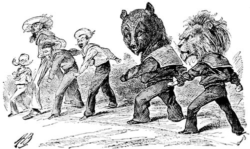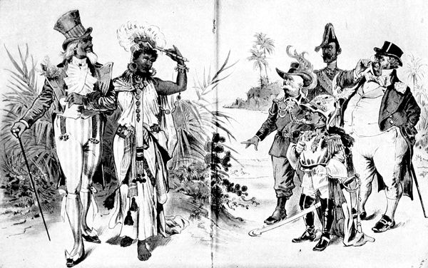 The Toronto Grip saw the matter in quite a different aspect. Hawaii, a badly frightened savage, is bound to a stake, while Uncle Sam, in the guise of a missionary, is whetting the knife of annexation, preparing to give him the coup-de-grace, and at the same time waving off John Bull, who holds his knife, "Protectorate," with similar intent. "Hold up," says Hawaii, "didn't you say it was wrong to eat man?" and Uncle Sam rejoins benevolently, "Yes—but—well, (p. 323) circumstances alter cases, and the interests of civilization and commerce, you know —— You keep off, John; he's my meat." The suggestion that England was merely waiting for a good excuse to step in and take possession of Hawaii, while the American administration and Congress were trying to reach an understanding, was eagerly seized upon by other journals as well as Grip, especially in Germany. The Berlin Ulk portrayed Queen Liliuokalani, armed with a broom, angrily sweeping Uncle Sam from his foothold in Honolulu, while John Bull, firmly established on two of the smaller islands, "laughs to his heart's content," so the legend runs, "but the Yankee is mad with rage." In similar spirit the Kladderadatsch depicts John Bull and Uncle Sam as "Two Good Old Friends," trying to "balance their interests in the Pacific Ocean." With clasped hands the two rivals are see-sawing backwards and forwards, each striving to retain a precarious foothold, as they straddle the Pacific from Samoa to Hawaii, and each quite oblivious of the discomfort of the squirming little natives that they are crushing under heel.