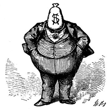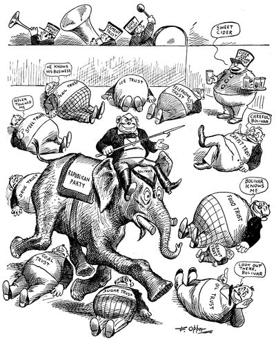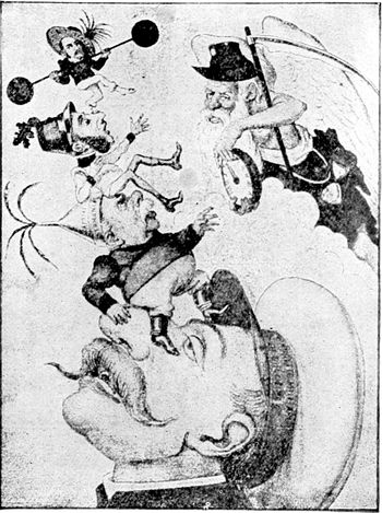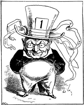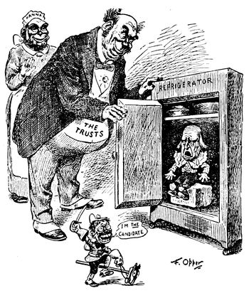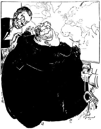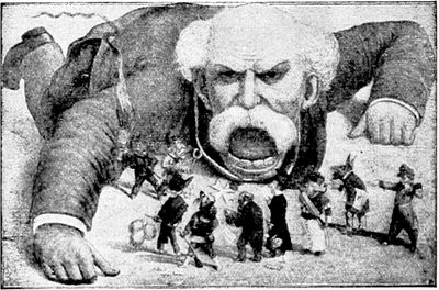 (p. 362) Of equal importance are the various series in lighter vein through which Mr. Opper aims to lead people to the same way of thinking politically as the paper which he serves. Long years of labor and constant production do not seem to have in any way drained his power of invention, for no sooner has one series done its work, and before the public has become sated with it, than an entirely new line of cartoons is introduced. Mr. Opper, as well as Mr. Davenport, has had his fling at and drawn his figure of the Trusts, and to place the two figures side by side is to contrast the methods and work of the men. Mr. Opper's purpose seems to be, first of all, to excite your mirth, and consequently he never fails to produce a certain effect. When you take up one of his cartoons in which the various stout, sturdy, and well-fed gentlemen typifying the different Trusts are engaged in some pleasant game the object of which is the robbing, or abusing of the pitiable, dwarfish figure representative of the Common People, your first impulse is a desire to laugh at the ludicrous contrast. It is only afterwards that you begin to think seriously how badly the abject little victim is being treated, and what a claim he has upon your sympathy and indignation. In those series which are designed entirely along party lines, such as "Willie and his Papa," this method is even more effective, since it begins by disarming party opposition.