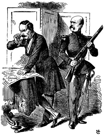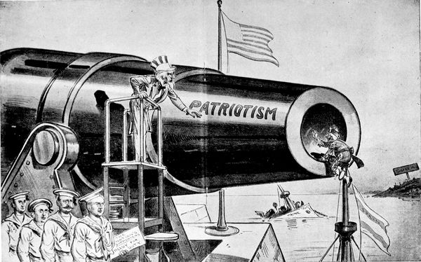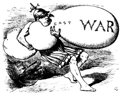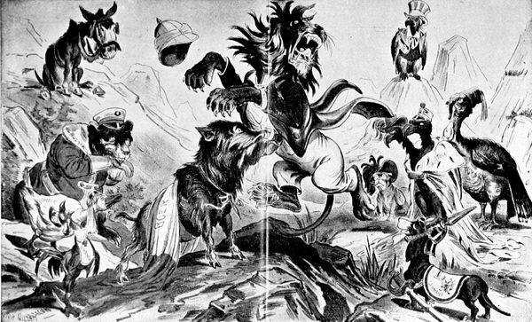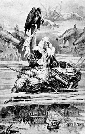 One of those cartoons which are not to be forgotten in a day or a week or a month; one which stirs the blood and rouses the mind to a new patriotism even when seen years after the events which inspired it, is Victor Gillam's "Be Careful! It's Loaded!" which appeared a few weeks before the outbreak of the Spanish-American War and which we deem worthy of being ranked among the twenty-five or thirty great cartoons which the nineteenth century has produced. To realize to-day its full force and meaning one has to recall the peculiar tension under which the American people were laboring during the months of February, March, and April, 1898. The Maine had been destroyed in Havana Harbor, and although, now that anger has died down, we can no longer cling implacably to the belief, which was then everywhere expressed, that it was an act emanating from the Spanish Government, at the time it was too much for our overwrought (p. 333) nerves; the condition of Cuba was growing every day more deplorable, and everyone felt that the inevitable conflict was hourly at hand. In the picture American patriotism is symbolized by a huge cannon. A diminutive Spaniard has climbed to the top of a mast of a Spanish vessel and monkey-like is shaking his fist down the muzzle. Uncle Sam, standing by the gun and realizing the Spaniard's imminent peril calls out, excitedly, "Be Careful! It's Loaded!" a warning to which the latter seems little inclined to pay any attention. In its very simplicity this cartoon differs greatly from most of those of the school of Puck and Judge. There is none of that infinite variety of detail which makes an elaborate study necessary in order to arrive at a full comprehension of the meaning of a cartoon. "Be Careful! It's Loaded!" like the most striking English and French cartoons, may be understood at a glance.