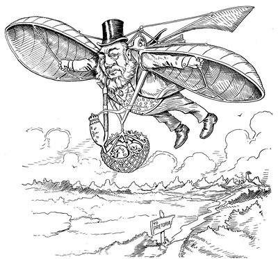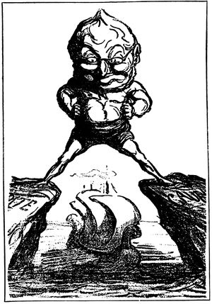 Another direct result of the influence of journalism upon caricature, in addition to that of compelling the artist to keep in closer touch than ever before with contemporary history, is the growing popularity of the series method—a method which dates back to the Macaire of Philipon and the Mayeux of Traviès, and which consists in portraying day by day the same more or less grotesque types, ever undergoing some new and absurd adventure. It is a method which suits the needs of artist and public alike. To the former, his growing familiarity with every line and detail of the features (p. 360) and forms of his pictorial puppets minimizes his daily task, while the public, even that part of the public which is opposed to comic art in general, or is out of sympathy with the political attitude of a certain series in particular, finds itself gradually becoming familiar with the series, through fugitive and unexpected glimpses, and ends by following the series with amusement and interest and a growing curiosity as to what new and absurd complications the artist will next introduce. This employment of the series idea is as successful in social as political satire. Mr. Outcault's "Yellow Kid" and "Buster Brown," Mr. Opper's "Happy Hooligan" and "Alphonse and Gaston," Gene Carr's "Lady Bountiful," and Carl Schultze's "Foxy Grandpa" are types that have won friends throughout the breadth of the continent. In the domain of strictly political caricature, however, there is no series that has attracted more attention than Homer Davenport's familiar conception of the Trusts, symbolized as a bulky, overgrown, uncouth figure, a primordial giant from the Stone Age. And since there have been a number of apocryphal stories regarding the source of Mr. Davenport's inspiration, it will not be without interest to print the artist's own statement. "As a matter of fact," he says, "I got the idea in St. Mark's Square in Venice. Seeing a flock of pigeons flying about in that neighborhood I immediately, with my love of birds and beasts, determined by fair means or foul to purloin a pair. I watched them fly hither and thither, and in following them came across a statue of Samson throwing some man or other—I forget his name—to the ground. The abnormal size of the muscles of the figure struck me at once, and turning round to my wife, who was with me, I said with a sudden inspired thought, 'The Trusts!'"