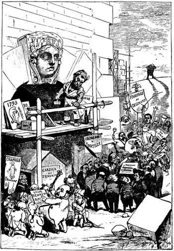 Perhaps the most famous of all the admirable cartoons dealing with l'Affaire was the "Design for a New French Bastile," which was of German origin and which caused the paper publishing it to be excluded from French territory. It appeared just after Colonel Henry had cut his throat with a razor in his cell in the Fortress of Vincennes, when suspicions of collusion were openly expressed, and some went so far as to hint that the prisoner's death might be a case of murder and not suicide. The "Design for a New French Bastile" (p. 349) showed a formidable fortress on the lines of the famous prison destroyed in the French Revolution with a row of the special cells beneath. In one of these cells a loaded revolver was placed conspicuously on the chair; in the next was seen a sharpened razor; from a stout bar in a third cell dangled a convenient noose. The inference was obvious, and the fact that the cells were labeled "for Picquart," "for Zola," "for Labori" and the other defenders of Dreyfus gave the cartoon an added and sinister significance. In caricature the Dreyfus case was a battle between a small number of Anti-Dreyfussard artists on the one hand, and the Dreyfus press with all the cartoonists of Europe and the United States as its allies on the other. The opportunity to exalt the prisoner, to hold him up as a martyr, to interpret pictorially the spirit (p. 350) of Zola's ringing "la vérité est en marche, et rien ne l'arrêtera!" offered a vast field for dramatic caricature. On the other hand the cartoon against Dreyfus and his defenders was essentially negative, and the wonder is that the rout of the minority was not greater—it should have been a veritable "sauve qui peut."