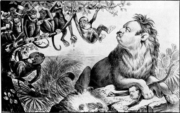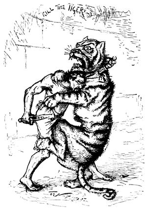 In connection with this campaign of 1892, there was no cartoon of more interest than that entitled "Where Am I At?" which Bernard Gillam drew for Judge, and this interest (p. 311) lies less in the cartoon itself than in the amusing story of its conception and execution. Right up to election day not only Gillam, but the entire staff of Judge, were perfectly confident of Republican success at the polls. To them the election seemed to be a mere formality which had to be gone through with, in order that General Harrison might remain in the White House for four years more. So a conference was held, after which Mr. Gillam began work on the cartoon which was to commemorate the Republican victory. The idea used was that of a general smash-up, with Mr. Cleveland in the middle of the débâcle and the Republican elephant marching triumphantly over the ruins. Along these lines a double-page cartoon was drawn with an immense variety of detail, reproduced, and made ready for the press. Election Day came around, and a few hours after the polls had been closed it became evident, to the consternation of Mr. Gillam and his associates, that instead of the expected Republican victory, Mr. Cleveland had swept the country by overwhelming (p. 313) majorities. What was to be done? It was too late to prepare another cartoon, so that the plate already made was taken from the press, and the cartoonist set to work. To the discomfited countenance of Mr. Cleveland Gillam attached a beard which transformed the face into a likeness to that of the defeated Republican candidate. A huge patch drawn over one of the eyes of the Republican elephant changed its appearance of elation to one of the most woe-begone depression. Other slight changes in the legends here and there throughout the picture transformed its nature to such an extent that only the most practiced eye could detect anything that was not wholly spontaneous and genuine. To cap it all, in a corner of the picture Gillam drew a likeness of himself in the form of a monkey turning an uncomfortable somersault. With a knowledge of these facts the reader by a close examination of this cartoon, which is reproduced in this volume, will undoubtedly detect the lines along which the lightning change was made. Nevertheless, it will be impossible for him to deny that the transformation was cleverly done.