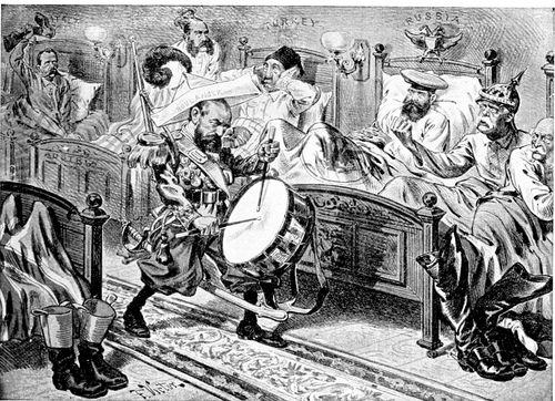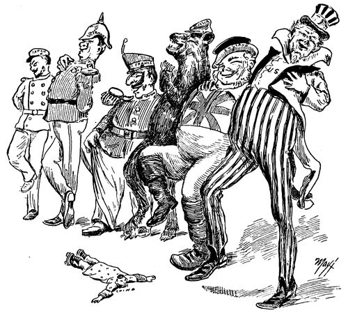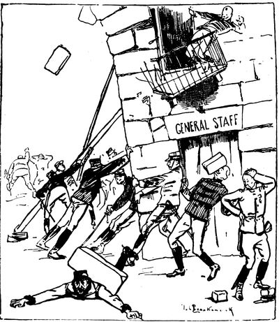 (p. 344) Although the German Government refused to interfere in the protracted struggle in the Transvaal, the sympathy of Germany with the Boers found expression in a host of cartoons, bitterly inveighing against British aggression. Thoroughly characteristic is one which appeared in the Lustige Blätter entitled "English World-Kingdom; or, Bloody Cartography." A grossly distorted caricature of Victoria is standing before a map of the world, and dipping her pen in a cup of blood, held for her by an army officer. Chamberlain, at her elbow, is explaining that "the lowest corner down yonder, must be painted red!" Another of the Lustige Blätter's grim cartoons, alluding to the terrible price in human life that England paid for her ultimate victory in the Transvaal, depicts Britannia, as Lady Macbeth, (p. 345) vainly trying to wash the stain from her bloody hands. "Out, damned spot!" In lighter vein is the cartoon which is here reproduced from the Wiener Humoristische Blätter showing "Oom Paul at His Favorite Sport." Kruger, rakishly arrayed in tennis garb, is extracting infinite enjoyment from the congenial exercise of volleying English soldiers, dressed up as shuttlecocks, over the "Transvaal net" into the watery ditch beyond.