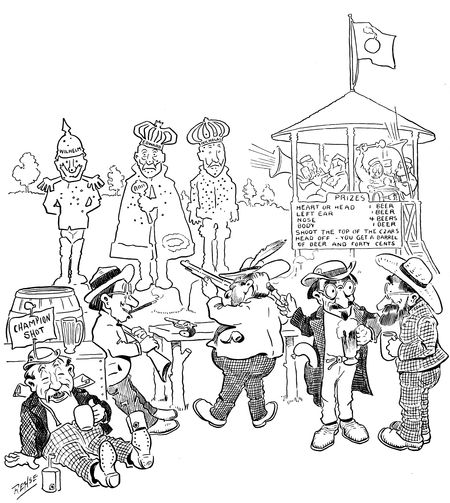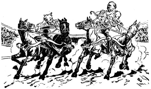 There are interest and significance in the fact that a majority of the ablest caricaturists of to-day are devoting their talents almost exclusively to the daily press. It is an exacting sort of work, exhaustive both physically and mentally. The mere idea of producing a single daily cartoon, week in and week out,—thirty cartoons a month, three hundred and sixty-five cartoons a year, with the regularity of a machine,—is in itself appalling. And yet a steadily growing number of artists are turning to this class of work, and one reason for this is that they realize that through the medium of the daily press their influence is more far-reaching than it possibly can be in the (p. 358) pages of the comic weeklies, and that at the same time the exigencies of journalism allow more scope for individuality than do the carefully planned cartoons of papers like Puck or Judge. Speed and originality are the two prime requisites of the successful newspaper cartoon of to-day, a maximum of thought expressed in a minimum of lines, apposite, clear-cut, and incisive, like a well-written editorial. Indeed, our leading cartoonists regard their art as simply another and especially telling medium for giving expression to editorial opinion. Mr. Bush, "the dean of American caricaturists," may be said to have spoken for them all when he said, in a recent interview, that he looks upon a cartoon as an editorial pure and simple.