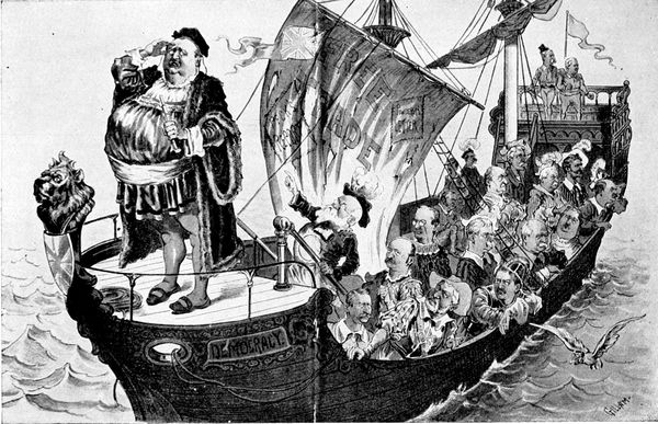 Besides being the year of the Presidential campaign, 1892 was a year when the thoughts of Americans were turned backward four centuries to the time when Christopher Columbus first landed on the shore of the Western Hemisphere. The original ships of Columbus's fleet were being brought over the water from Spain; the Columbus idea was being exploited everywhere in topical song and light opera; and it would have been strange indeed if it had failed to play some part in political caricature. Gillam in Judge made use of it in the cartoon entitled "The Political Columbus Who Will NOT Land in '92." It represents the ship of the Democracy with Mr. Cleveland as Columbus gazing anxiously and uneasily (p. 315) at the horizon. At the bow of the ship is the lion's head and the shield of Britannia, in allusion to Mr. Cleveland's alleged pro-English sympathies. The sail upon which the ship is relying for its progress is marked "Free Trade" and is a woefully patched and weather-beaten bit of canvas. The crew of the ship is a strange assortment which suggests all sorts of mutiny and piracy. In the front of the vessel and close behind the captain are Dana, Croker, Sheehan, and Hill. Beyond them we see the figures of Cochran, Carlisle, Crisp, Brice, and Mills and Flower. In the far aft are Blackburn and Gorman. Evidently crew and captain are animated by despair, although the gull, bearing the features of Mr. Pulitzer, of the New York World, that is circling around the ship, shows that land is not so many miles away. "I don't see land," cries Cleveland-Columbus. And the despairing crew, pointing to the Free Trade sail, calls back, "And you never will with that rotten canvas."