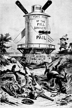 The caricature produced by the campaign between Mr. McKinley and Mr. Bryan in 1900 offers few, if any, cartoons more admirable than that by Mr. Victor Gillam, representing Don Quixote Bryan meeting disaster in his fight against the full dinner pail. This cartoon has that literary flavor which has been too much lacking in American caricature, and which raises this particular cartoon far above the average in the same school. The idea, of course, is based on Don Quixote's disastrous encounter with the windmill, which that poor crack-brained gentleman took to be a giant. The body of the windmill is a huge dinner pail and its arms are a crossed knife (p. 329) and fork. Don Quixote, incased in armor from head to foot, and mounted on the Democratic donkey with free silver for a saddle, has tilted against the solid structure with disastrous results. His lance is shattered, and he and his faithful steed lie prostrate and discomfited on opposite sides of the road. The Sancho Panza needed to complete the picture appears under the familiar features of Mr. Richard Croker, who, leading the Tammany Tiger by a rope, is hurrying to his master's assistance. In the distance may be seen the White House, but the road in that direction is completely barred by the stanch windmill that has so successfully resisted the mad knight's onslaught.