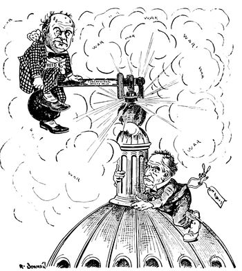 The pent-up feeling throughout the United States, which reached a dangerous degree of tension during the weeks preceding the declaration of war against Spain, was forcibly symbolized in the Minneapolis Herald. The dome of the National Capitol is portrayed, surmounted by a "Congressional safety-valve." McKinley, clinging to the cupola, is anxiously listening to the roar of the imprisoned steam, which is escaping in vast "war clouds," in spite of all the efforts of Speaker Reed, who is freely perspiring in his effort to hold down the valve.