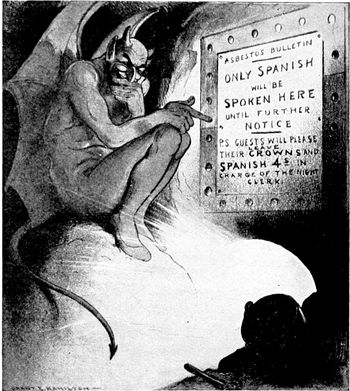 (p. 334) A cartoon like Grant E. Hamilton's "The Latest War Bulletin" we find amusing at the present time. We did not find it so a little over five years ago. This latest war bulletin, printed in asbestos, is supposed to have been just received from the infernal regions. His Satanic majesty, with a sardonic grin upon his face, has just composed it to his own entire satisfaction. Marked up on the burning furnace of Hades it reads: "Only Spanish will be spoken here until further notice—P.S. Guests will please leave their crowns and Spanish 4's in charge of the night clerk."