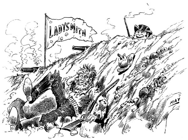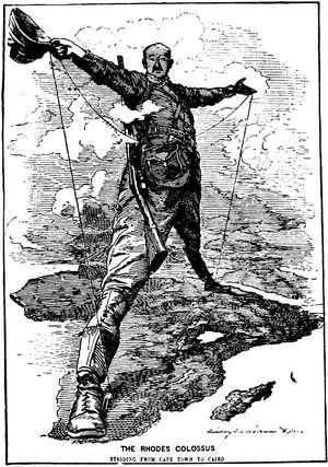 A cartoon which was a forerunner of the Transvaal War and the railway between Capetown and Cairo was that entitled "The Rhodes Colossus," which appeared in Punch December 10, 1892. It was by the hand of Linley Sambourne. It shows a colossal figure of Cecil Rhodes standing on a map of Africa with one foot planted in Egypt and the other at the Cape. In his hands he holds a line suggesting the telegraph wire connecting the two places.