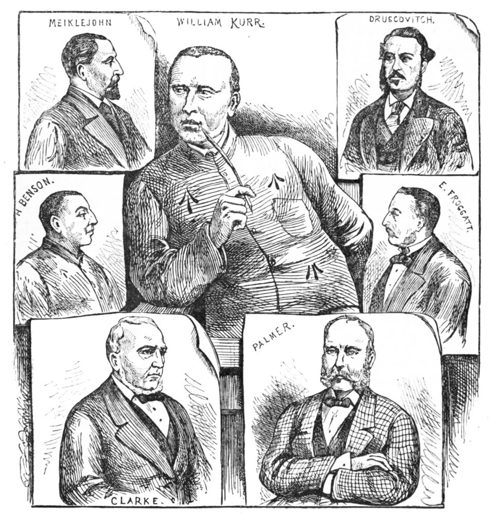 When Clarke, Druscovitch, Meiklejohn, and Palmer, with Froggatt, were put upon their trial, the facts, as already stated, were elicited, and it was found that the swindlers had long secured the connivance and support of all these officers, except Clarke. A letter, which was impounded, written by Meiklejohn to Kurr as far back as 1874, shows how eager Meiklejohn was to earn his money. It was an early notification of the issue of a warrant, and warned his friends to keep a sharp look out:—