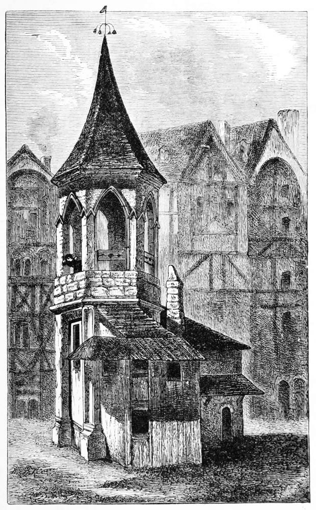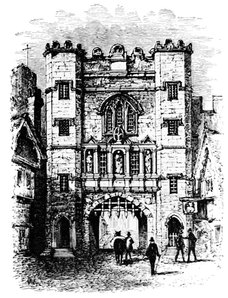 THE earliest authentic mention of Newgate as a gaol or prison for felons and trespassers occurs in the records of the reign of King John. In the following reign, A.D. 1218, Henry III. expressly commands the sheriffs of London to repair it, and promises to reimburse them for their outlay from his own exchequer. This shows that at that time the place was under the direct control of the king, and maintained at his charges. The prison was above the gate, or in the gate-house, as was the general practice in ancient times. Thus Ludgate was long used for the incarceration of city debtors. To the gate-house of Westminster were committed all offenders taken within that city; and the same rule obtained in the great provincial towns, as at Newcastle, Chester, Carlisle, York, and elsewhere. Concerning the gate itself, the New Gate and its antiquity, opinions somewhat differ. Maitland declares it to be “demonstrable” that Newgate was one of the four original gates of the city; “for after the fire of London in 1666,” he goes on to say, “in digging a foundation for the present Holborn bridge, the vestigia of the Roman military way called Watling Street were discovered pointing directly to this gate; and this I take to be an incontestable proof of an original gate built over the said way in this place.” Maitland in this conjecture altogether departs from the account related by Stowe. The latter gives a precise and circumstantial description of the building of Newgate, which he calls the fifth principal gate of the city. There is, however, every reason to suppose that a gate had existed previously hereabouts in the city wall, and the site of the new gate is identical with one which was long called Chamberlain’s Gate, because that official had his court in the Old Bailey hard by. According to Stowe, Newgate was erected about the time of Stephen or the first Henry under the following circumstances. After the destruction of the old cathedral church of St. Paul in 1086, Mauritius, Bishop of London, resolved to build an entirely new edifice upon the site, intending to construct a work so grand that “men judged it would never be performed, it was so wonderful to them for height.”[6] In pursuance of his great scheme the Bishop enclosed a large space of ground for cemetery and churchyard, and in doing so stopped up and obstructed the great thoroughfare from Aldgate in the east to Ludgate in the west. The traffic now was driven to choose between two long detours: one passing to the northward of the new cemetery wall, and so by Paternoster Row, Ave Maria Lane, and Bowyer Row, to Ludgate; the other, still more circuitous, by Cheape and Watling Street, thence southward through Old Change, west through Carter Lane, up Creadlam north, and finally westward again to Ludgate. These routes, as Stowe observes, were “very cumbersome and dangerous both for horse and man. For remedy whereof a new gate was made and so called, by which men and cattle, with all manner of carriages, might pass more directly (as before) from Aldgate through West Cheape to St. Paul’s on the north side, through St. Nicholas Shambles and Newgate market to Newgate, and from thence to any part westward over Holborn Bridge, or turning without the gate into Smithfield and through Iseldon (Islington) to any part north and by west.”
