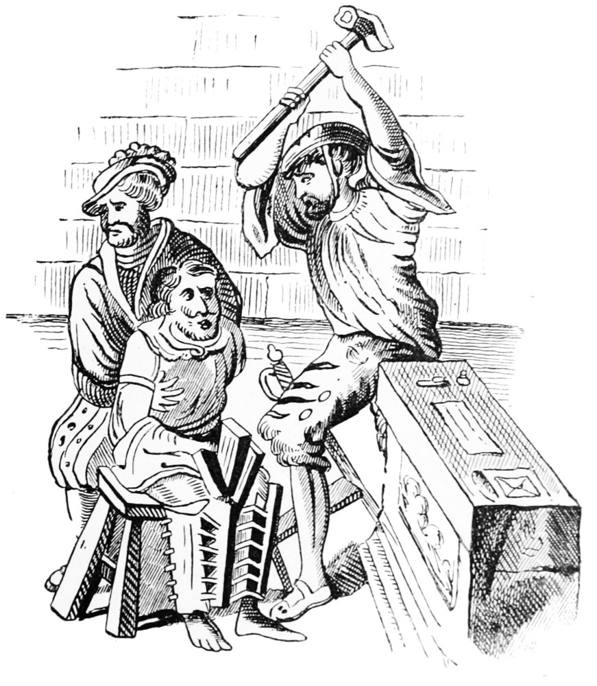 In 1316 Gilbert Peny was bound in the third time in default for selling bread deficient in weight. He had been twice drawn on the hurdle, and it was therefore now adjudged that he should be drawn once more, and should then forswear the trade of a baker in the city for ever. One of many similar cases is that of William Spalyng, who, for selling putrid beef at “les Stokkes,” the stocks market near Walbrook, was put upon the pillory, and the carcases were burnt beneath. Another who made shoes of unlawful material had them forfeited. Bakers who stole dough from the moulding-boards of other bakers were exposed on the pillory with the dough hung about their necks[11].