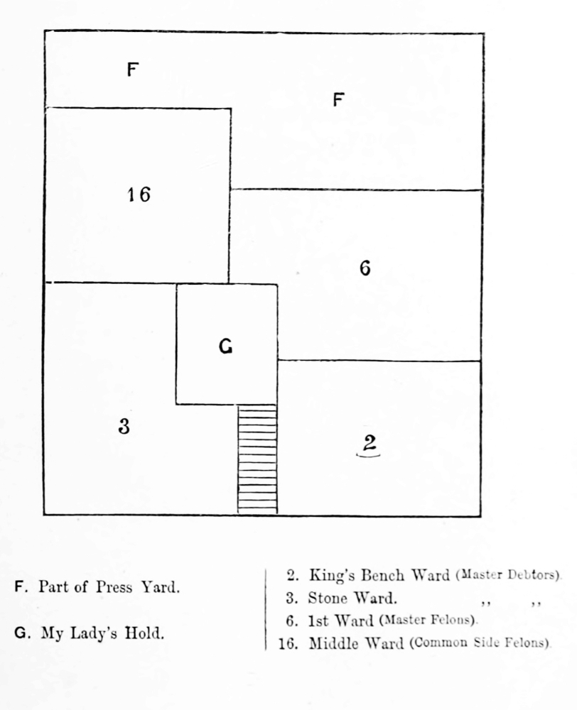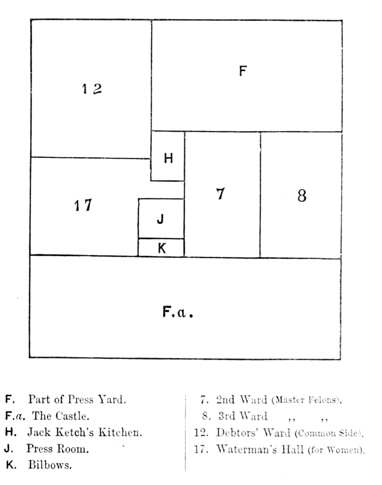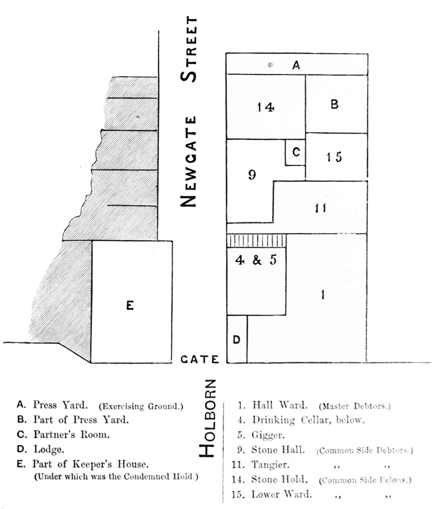 With occasional, but not always sufficient, repairs, but without structural alterations, Whittington’s Newgate continued to serve down to the seventeenth century. About 1629 it was in a state of utter ruin, and such extensive works were undertaken to re-edify it that the security of the gaol was said to be endangered, and it was thought better to pardon most of the prisoners before they set themselves free. Lupton, in his ‘London Carbonadoed,’ speaks of Newgate as “new-fronted and new-faced” in 1638. Its accommodations must have been sorely tried in the troublous years which followed. It seems to have been in the time of the Commonwealth when “our churches were made into prisons,” and demands for space had greatly multiplied, that Newgate was increased by the addition of the buildings belonging to the Phœnix Inn in Newgate Street. The great fire of 1666 gutted, if not completely destroyed, Newgate, and its reconstruction became imperative. Some say Wren was the architect of the new prison, but the fact is not fully substantiated. Authentic and detailed information has, however, been preserved concerning it; it is figured in a familiar woodcut which may be seen in every modern history of London, while a full description of the interior, both plan and appropriation, has been left by an anonymous writer, who was himself an inmate of the gaol[2]. The prison was still subordinated to the gate, which was an ornate structure, with great architectural pretensions. But as a writer in the ‘Gentleman’s Magazine’ well put it about a century ago, “The sumptuousness of the outside but aggravated the misery of the wretches within.” Some effort was made to classify, and the Newgate of that day contained five principal divisions or sides: there was the master’s side, for debtors and felons respectively; the common side, for those same two classes of prisoners; and lastly the press yard, for prisoners of note. The right to occupy the master’s side was a luxury dearly purchased, but the accommodation obtained, albeit indifferent, was palatial to that provided for the impecunious on the common side. The only inmates of the Newgate prison I am now describing who were comparatively well off, were those admitted to the press yard; a division composed of “large and spacious rooms” on all the three floors of the prison, and deemed by a legal fiction to be part of the governor’s house.