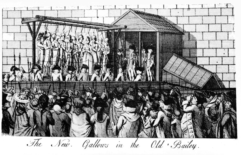 The actual ceremony was to the last degree cold-blooded and wanting in all the solemn attributes fitting the awful scene. The doomed was carried in an open cart to Tyburn or other appointed place; the halter already encircled his neck, his coffin was at his feet, by his side the chaplain or some devoted amateur philanthropist and preacher striving earnestly to improve the occasion. For the mob it was a high day and holiday; they lined the route taken by the ghastly procession, encouraging or flouting the convict according as he happened to be a popular hero or unknown to criminal fame. In the first case they cheered him to the echo, offered him bouquets of flowers, or pressed him to drink deep from St. Giles’s Bowl; in the latter they pelted him with filth and overwhelmed him with abuse. The most scandalous scenes occurred on the gallows. The hangman often quarrelled with his victim over the garments, which the former looked upon as a lawful perquisite, and which the latter was disposed to distribute among his friends; now and again the rope broke, or the drop was insufficient, and Jack Ketch had to add his weight to the hanging body to assist strangulation. Occasionally there was a personal conflict, and the hangman was obliged to do his office by sheer force. The convicts were permitted to make dying speeches, and these orations were elaborated and discussed in Newgate weeks before the great day; while down in the yelling crowd beneath the gallows spurious versions were hawked about and rapidly sold. It was a distinct gain to the decency and good order of the metropolis when Tyburn and other distant points ceased to be the places of execution, and hangings were exclusively carried out in front of Newgate, just over the debtors’ door. But some of the worst features of the old system survived. There was still the melodramatic sermon, in the chapel hung with black, before a large congregation collected simply to stare at the convicts squeezed into one pew, who in their turn stared with mixed feelings at the coffin on the table just before their eyes. There was still the same tumultuous gathering to view the last act in tragedy, the same bloodthirsty mob swaying to and fro before the gates, the same blue-blooded spectators, George Selwyn or my Lord Tom Noddy, who breakfasted in state with the gaoler, and so got a box seat or rented window opposite at an exorbitant rate. The populace were like degenerate Romans in the amphitheatre waiting for the butchery to begin. They fought and struggled desperately for front places: people fell and were trampled to death, hoarse roars came from thousands of brazen throats, which swelled into a terrible chorus as the black figures of the performers on the gallows stood out against the sky. “Hats off!” “Down in front!” these cries echoed and re-echoed in increasing volume, and all at once abruptly came to an end—the bolt had been drawn, the drop had fallen, and the miserable wretch had gone to his long home.