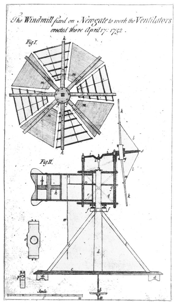 [185] A full account of the ventilator from the pen of Dr. Hales is published in the ‘Gentleman’s Magazine,’ vol. xxii. p. 180 (1752), where also is the plan of the windmill which worked it, which plan I have introduced into this chapter. The various letters on the plan refer to the detailed description in the original.