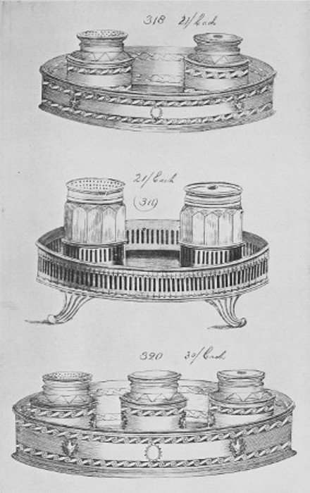 | CAKE BASKETS, DECANTER STANDS (COASTERS), DISH OR POTATO RINGS, INKSTANDS AND TAPER HOLDERS | 159 | |