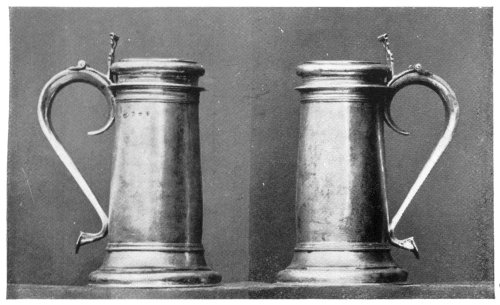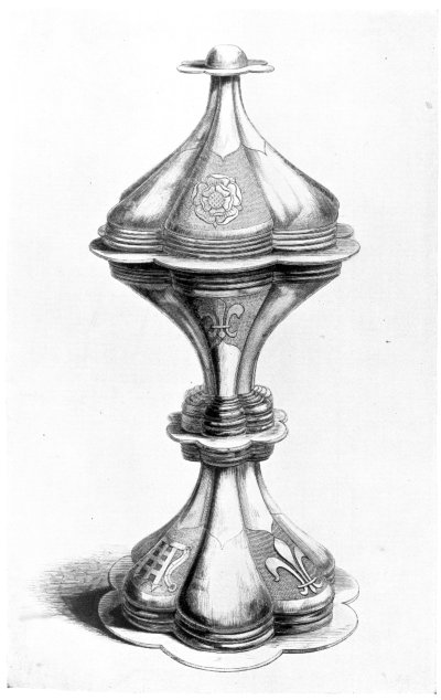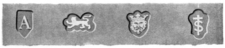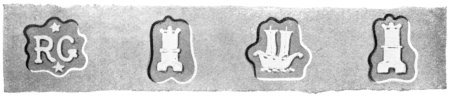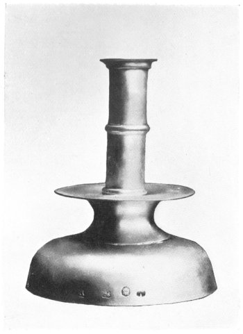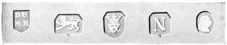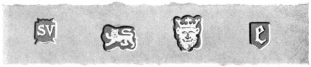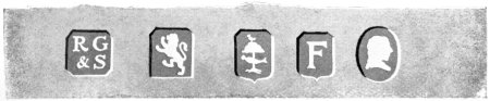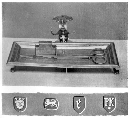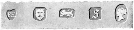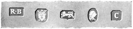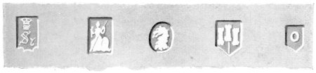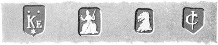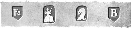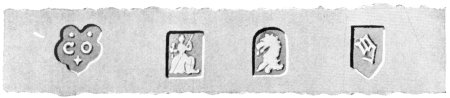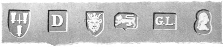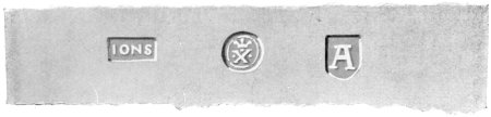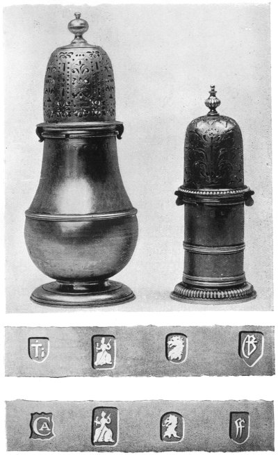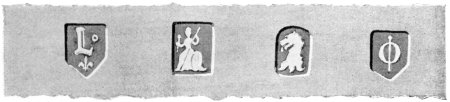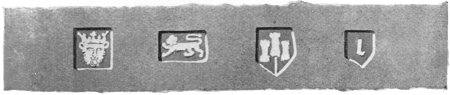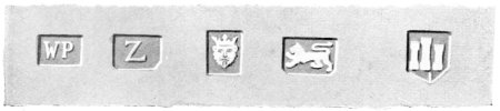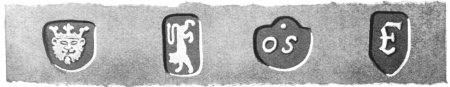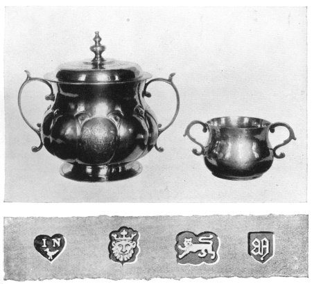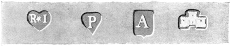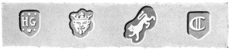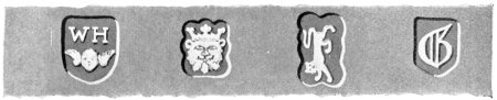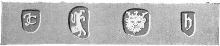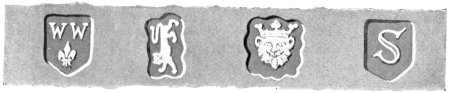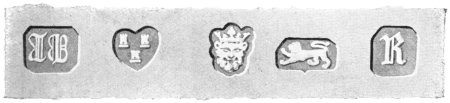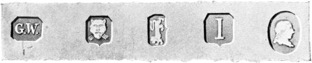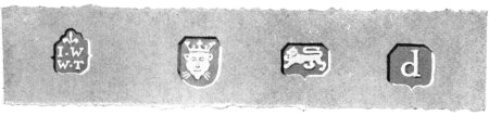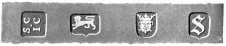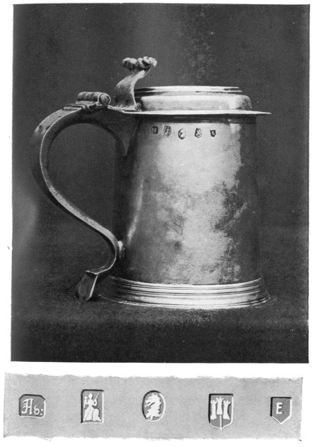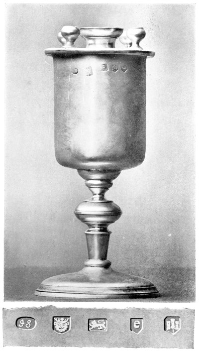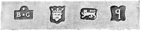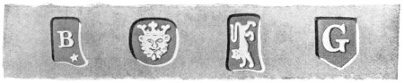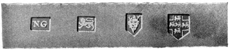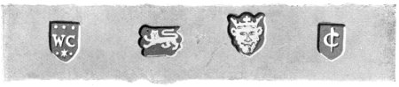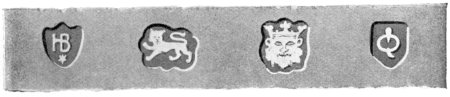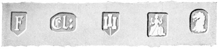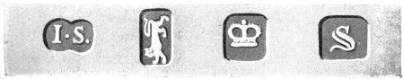 The marks on silver are stamped, the design thus appears in relief, while the edges of the shield on which it appears are sunk. The reproduction of this has offered a difficulty in illustration in all volumes{14} on old silver. To print black letters or designs on a white background, although easy, is unsatisfactory. On the contrary, to print the raised design in white on a dead black background is not a realistic presentation of the mark as it appears to the eye. After many experiments I have reproduced the marks in a manner more closely approaching their actual appearance, and less suggestive of black-and-white designs on paper.