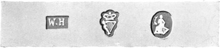 [7] The Position of Marks. Marks are not placed on old silver in a straight line. They are shown in this manner in this volume for convenience, and are the author’s own arrangement. They are in practice irregularly stamped, sometimes in a circle and sometimes upside down. It must be borne in mind that the maker put his mark on first prior to sending the piece to the Assay Office. The remaining marks were stamped thereon under the direction of the Wardens. Although the maker’s mark was stamped first, some of the other marks were often placed on each side of it.