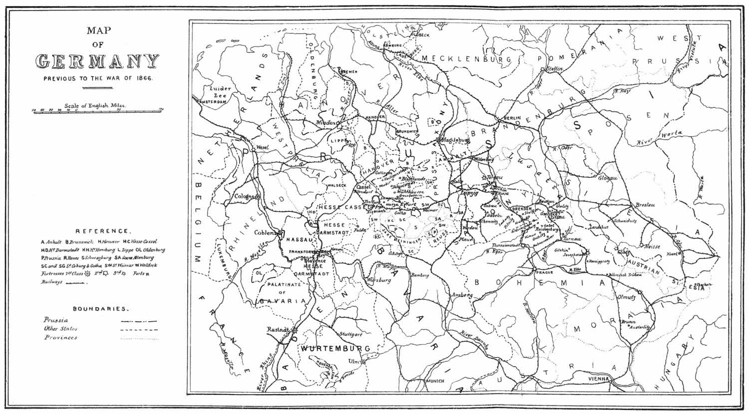 The German war of 1866, generally known as “the Seven Weeks’ War,” presents many features of interest to the student, the statesman and the soldier. It closed a strife of centuries between opposing nations and antagonistic political ideas. It resulted in the formation of the North German Confederation, and thus planted the seeds of a nation, which germinated four years later, during the bloody war with France. It banished Austria from all participation in the affairs of Germany, expelled her from Italy, and deflected her policy thenceforth towards the east and south. It demonstrated that preparation for war is a more potent factor than mere numbers in computing the strength of a nation; and it gave an illustration on a grand scale of the new conditions of war resulting from the use of the telegraph, the railroad and breech-loading firearms.