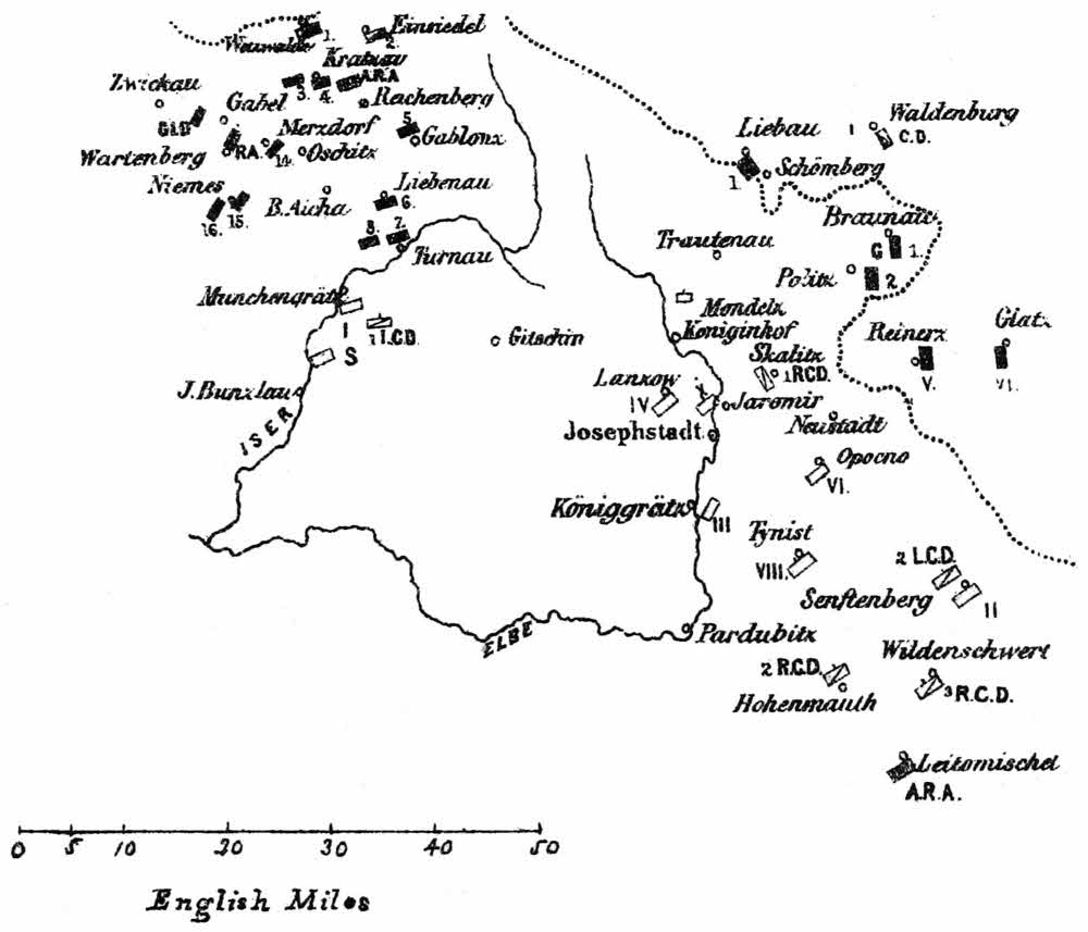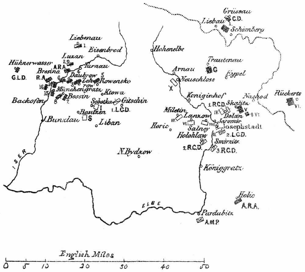 [7] It should be remembered that, in addition to the four corps immediately opposed to the Crown Prince, the IIId and IId Austrian Corps were at Von Benedek’s disposal; the latter being scarcely more than two marches distant from Josephstadt.