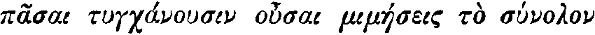 We have arrived at this, then; that Poetry's chief function is to reconcile the inner harmony of Man (his Soul, as we call it) with the outer harmony of the Universe. With this conception of "peerless Poesie" in our minds, we turn to Aristotle's Poetics, and it gives us a sensible shock to read on the first page, that "Epic Poetry and Tragedy, Comedy also and dithyrambic Poetry, and the greater part of the music of the flute and of the lyre are all, generally speaking, modes of imitation" (πασαι τυγχανουσιν ουσαι μιμησεις το συνολον[1]). "What?" we say—"Nothing better than that?"—for "imitation" has a bad name among men and is apt to suggest the ape. But, first bearing in mind that there are imitations and imitations (the Imitatio Christi among them), let us go on to see what it is that in Aristotle's opinion Poetry imitates or copies. It is "the Universal" (το χαθολου[2]): and as soon as we realise this we know ourselves to be on the same track as Aristotle, after all. "Imitation," as he uses it, is not an apish or a slavish imitation; it is no mere transcribing or copying of phenomena as they pass (he even allows that the poet may "imitate" men as "better than they are"): it is an expressing, in fiction and harmonious speech, intelligible to his fellow-men, of what truth, order, harmony, and "law" the poet's mind has apprehended in the outer Universe. No fair-minded reader of the Poetics, as he lays down the treatise, will doubt that this, or something like this, was Aristotle's meaning, nor is it probable that he will find any essential difference (or any difference that seriously disturbs agreement) between Aristotle's "Universal" and the Platonic "Idea" or pattern of things "laid up somewhere in the heavens."