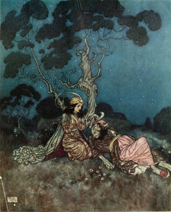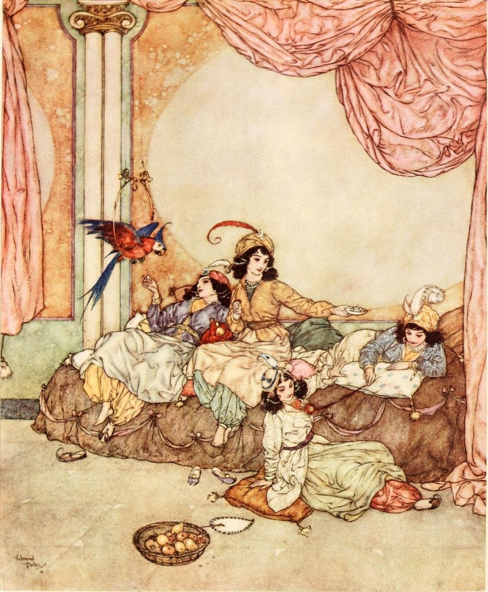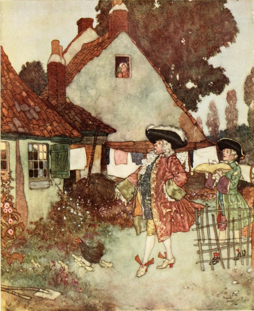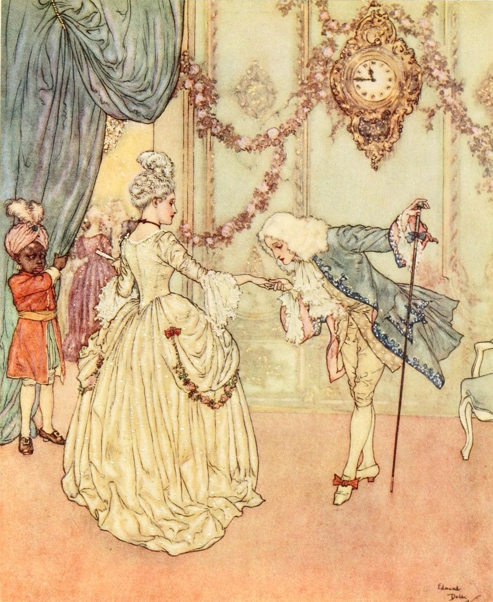 Of all the volumes in the Cabinet, possibly the most famous are the first and second, containing the fairy tales of Charles Perrault and Madame d'Aulnoy, and vols. 7–11, containing M. Galland's version (so much better than any translation) of The Arabian Nights. I hope that one of those days Mr. Dulac will lay the public under debt by illustrating all these, and the stories of Antony Hamilton to boot. Meanwhile, here are three of the most famous tales from Perrault's wallet, and one, the evergreen Beauty and the Beast, by an almost forgotten authoress, Madame de Villeneuve.