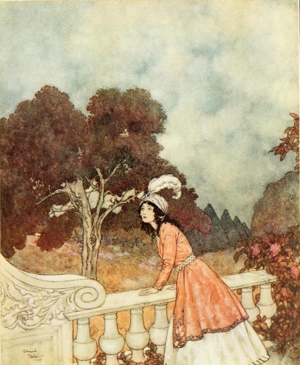 Since Perrault, who is usually accepted as the fountainhead of these charming French fairy-stories, belongs almost entirely to the seventeenth century, it may be asked why Mr. Dulac has chosen to depict his Princes and Princess in costumes of the eighteenth? Well, for my part, I hold that he has obeyed a just instinct in choosing the period when the literature he illustrates was at the acme of its vogue. But his designs, in every stroke of which the style of that period is so unerringly felt, provide his best apology.