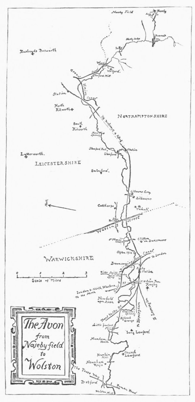 Naseby, however, has another boast. Here, beside the monument, we are standing on the water-shed of England. In the fields below rise many little springs, whereof those to the south and east unite to form the Ise brook, which runs into the Nen, and so find their goal in the North Sea; those to the west form the Avon, and seek the British Channel. And it is westward that we turn our faces—we, whom you shall briefly know as P. and Q.; for the business that brings us to Naseby is to find here the source of Shakespeare’s Avon, and so follow its windings downward to the Severn.