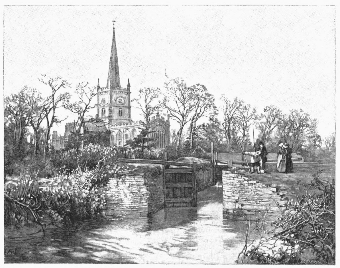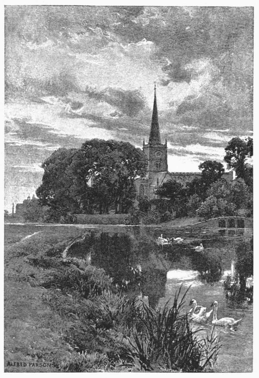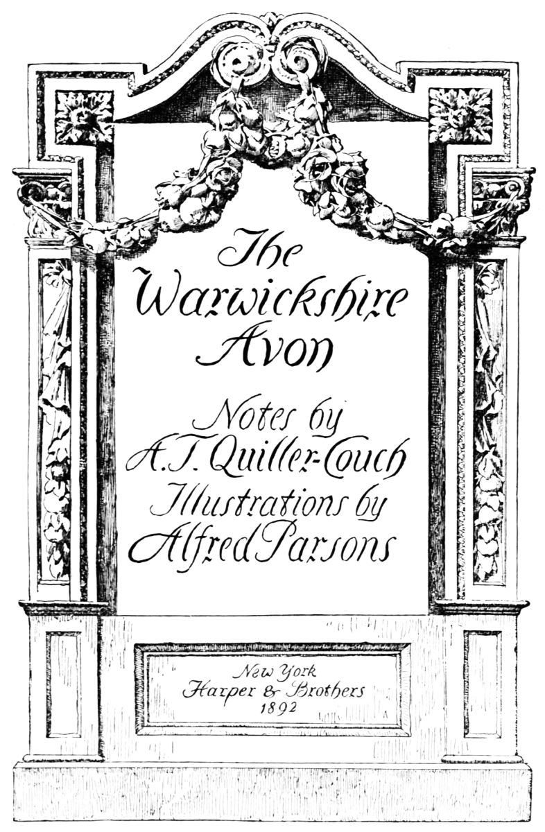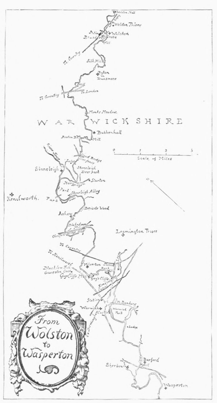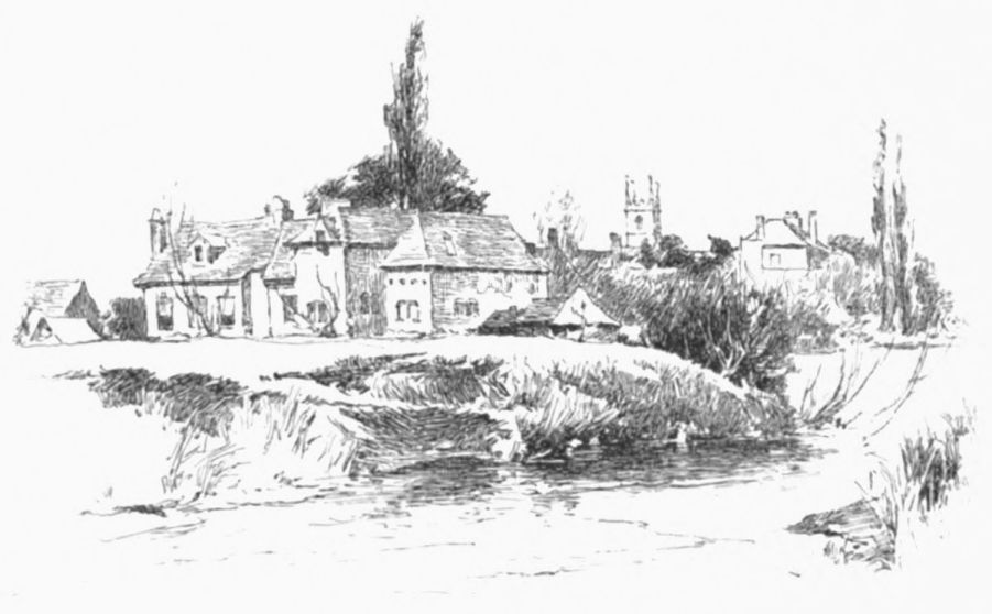 On the site of this abbey—founded circa 1155 by William de Wydeville in honor of the Blessed Virgin—now stands a red-brick farm-house, passably old, and coated with ivy. Of the vanished building it conserves but two relics—a stone coffin and the floriated cover of another. The course of the stream beside it, and for some way below, is traced by the thorn-bushes under which it winds (in springtime how pleasantly!) until Welford is reached—a small brick village. Here, after rioting awhile in a maze of spendthrift channels, it recombines its waters to run under its first bridge, and begin a sober life by supplying a branch of the Grand Junction Canal. A round-house at the canal’s head forms, with the bridge, what Mr. Samuel Ireland, in his Beauties of the Warwickshire Avon (1795), calls “an agreeable landscape, giving that sort of view which, being simple in itself, seldom fails to constitute elegance.” Rather, to our thinking, the landscape’s beauty lies in its suggestion, in that here we touch the true heart of the country life; of quiet nights dividing slow, familiar days, during which man and man’s work grow steeped in the soil’s complexion, secure of all but{13}