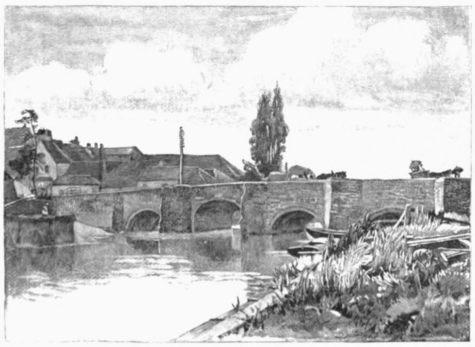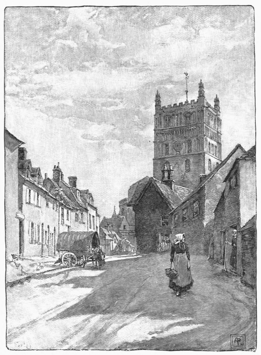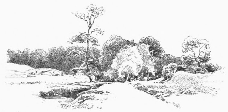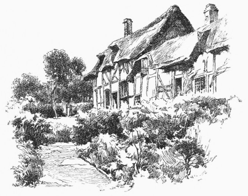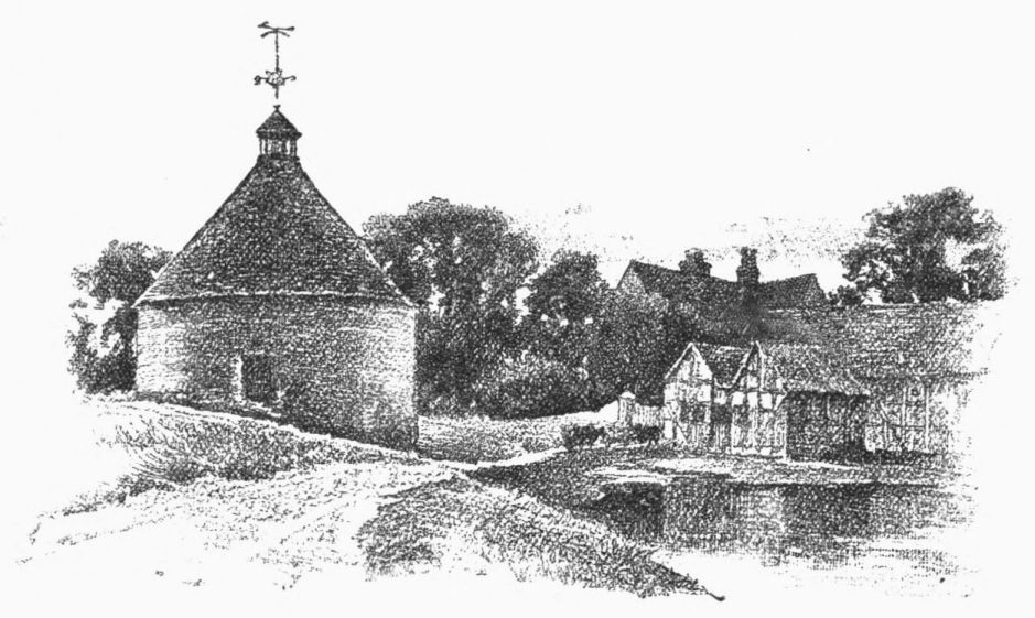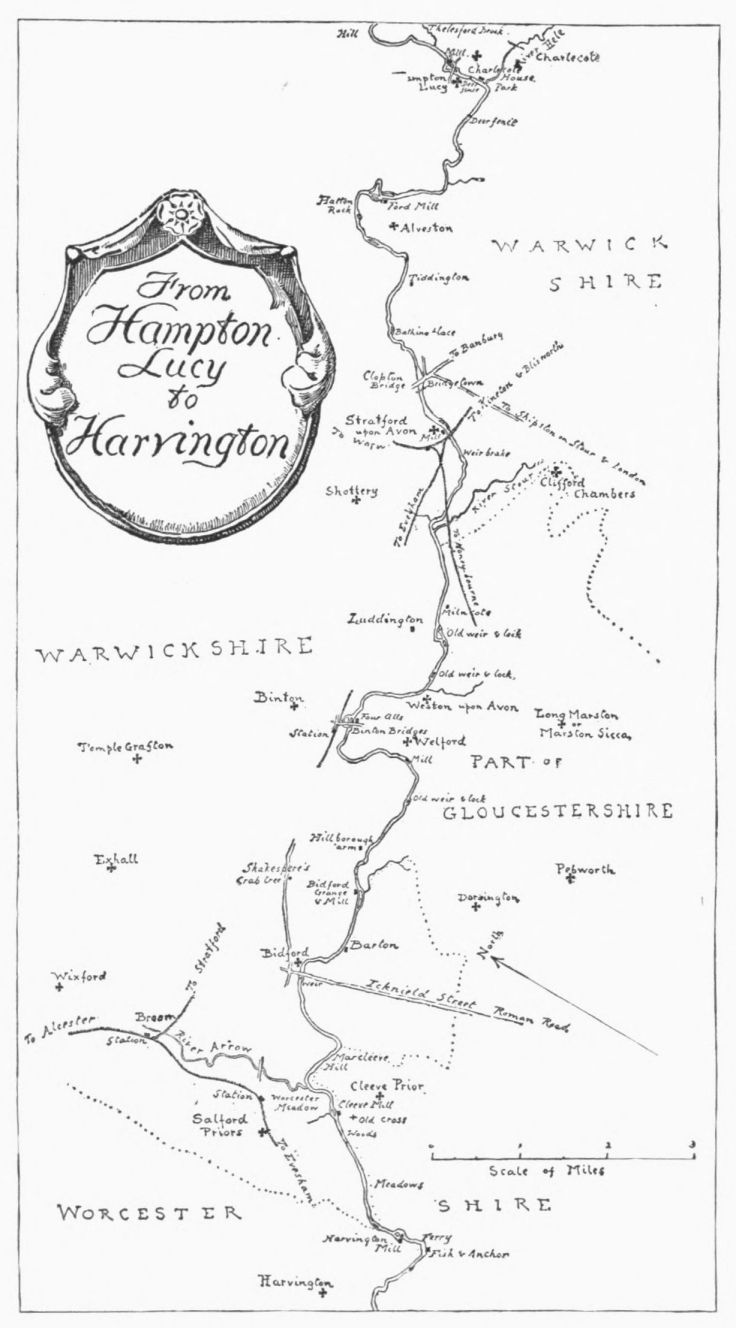 On the site of this abbey—founded circa 1155 by William de Wydeville in honor of the Blessed Virgin—now stands a red-brick farm-house, passably old, and coated with ivy. Of the vanished building it conserves but two relics—a stone coffin and the floriated cover of another. The course of the stream beside it, and for some way below, is traced by the thorn-bushes under which it winds (in springtime how pleasantly!) until Welford is reached—a small brick village. Here, after rioting awhile in a maze of spendthrift channels, it recombines its waters to run under its first bridge, and begin a sober life by supplying a branch of the Grand Junction Canal. A round-house at the canal’s head forms, with the bridge, what Mr. Samuel Ireland, in his Beauties of the Warwickshire Avon (1795), calls “an agreeable landscape, giving that sort of view which, being simple in itself, seldom fails to constitute elegance.” Rather, to our thinking, the landscape’s beauty lies in its suggestion, in that here we touch the true heart of the country life; of quiet nights dividing slow, familiar days, during which man and man’s work grow steeped in the soil’s complexion, secure of all but{13}