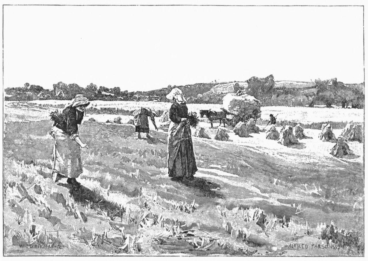 It is enough that we are grateful for it as we pass on down the valley where the canal and stream run side by side—the canal demurely between straight banks, the stream below trying always how many curves it can make in each field, until quieted for a while by the dam of a little red-brick mill, set down all alone in the brilliant green. The thorn-bushes are giving place to willows—not such as fringe the Thames, but gray trees of a smaller leaf, and, by your leave, more beautiful. Our walk as we follow the towpath of the canal, having the river on our left, is full of peaceful incidents and subtle revelations of color—a lock, a quaint swing-bridge, a swallow taking the sunlight on his breast as he skims between us and the inky clouds, a white horse emphasizing the meadow’s verdure. The next field holds a group of sable—a flock of rooks,{14} a pair of black horses, a dozen velvet-black oxen, beside whom the thirteenth ox seems consciously indecorous in a half-mourning suit of iron-gray. Next, from a hawthorn “total gules” with autumn berries, we start six magpies; and so, like Christian, “give three skips and go on singing” beneath the spires and towers of this and that small village (Welford and North and South Kilworth) that look down from the edging hills.